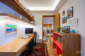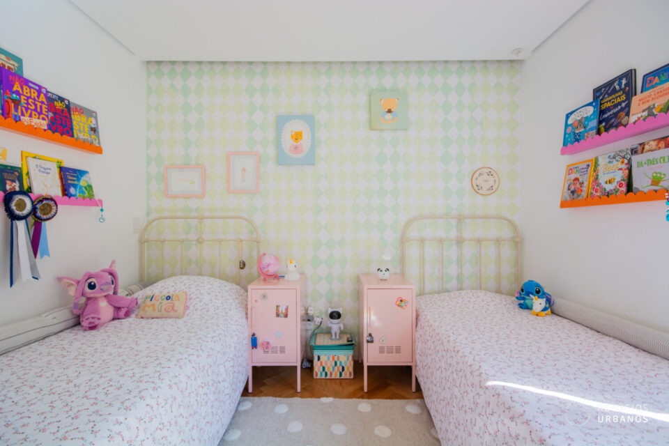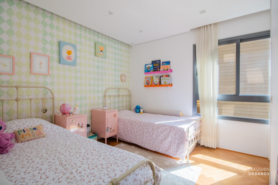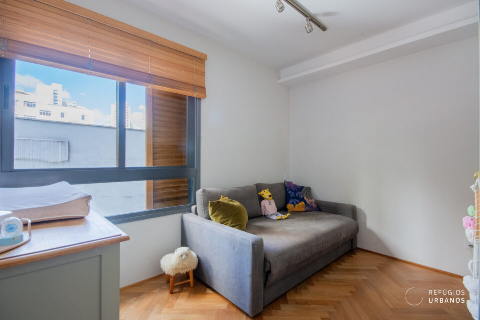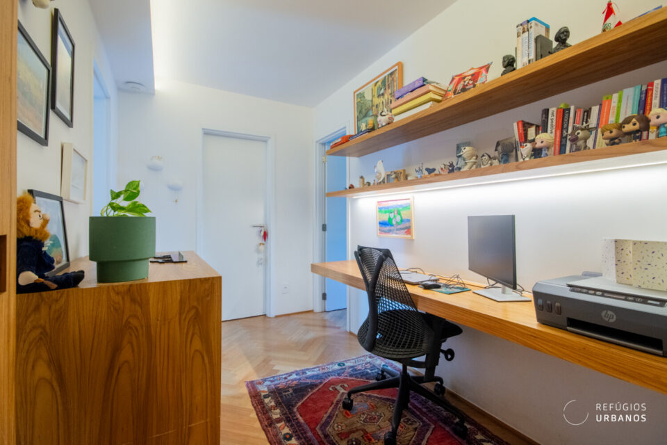 Ao entrar na ala íntima do apê, encontramos uma antessala onde atualmente funciona um espaço de home office. Com facilidade, esse ambiente também pode virar uma sala de TV ou uma área de convivência, dependendo das suas necessidades.