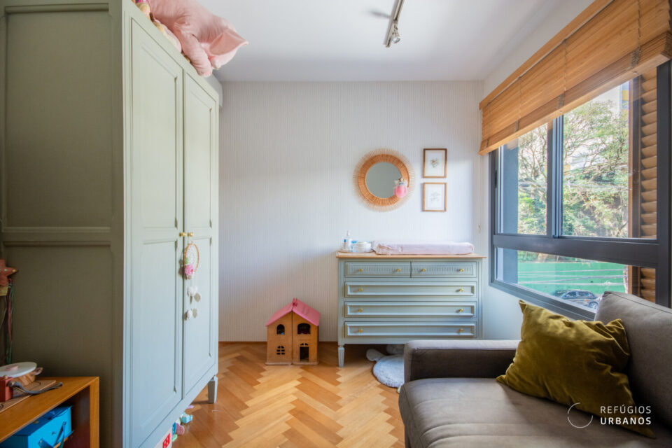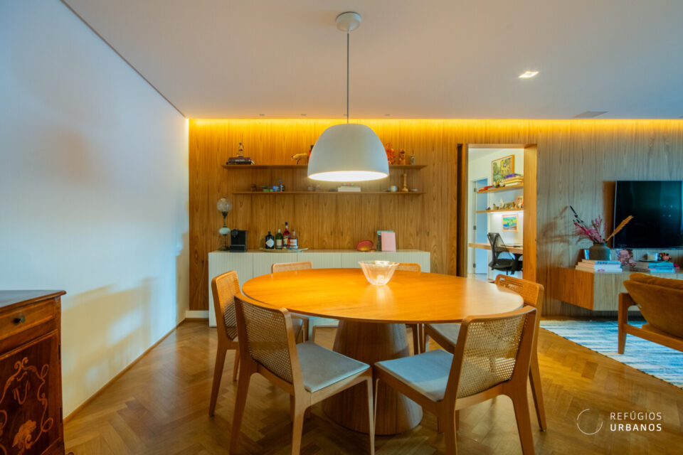 Além disso, o piso de madeira segue um padrão igualmente clássico e sofisticado de escama de peixe, que traz ainda mais personalidade aos ambientes.
