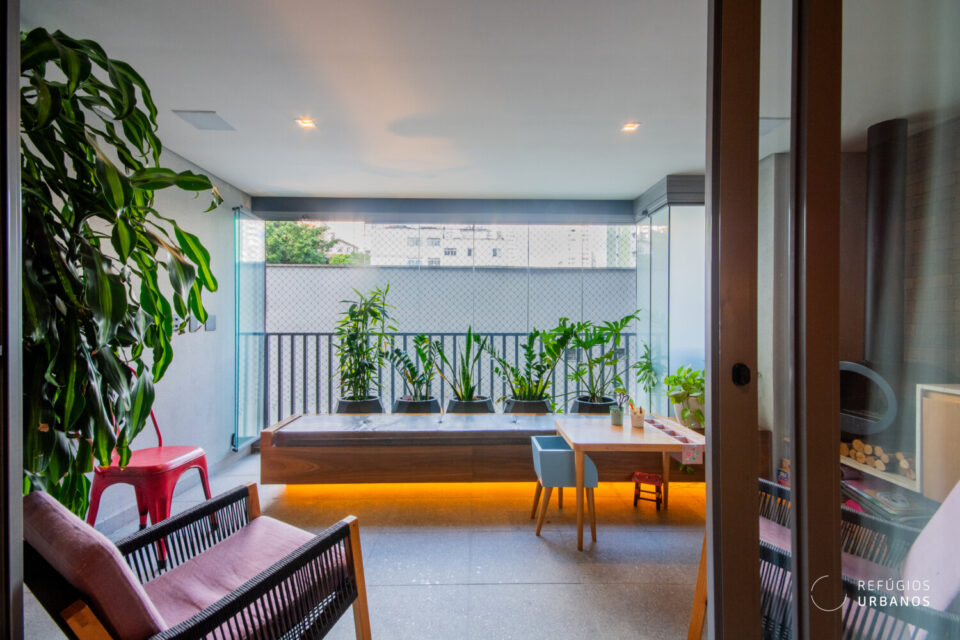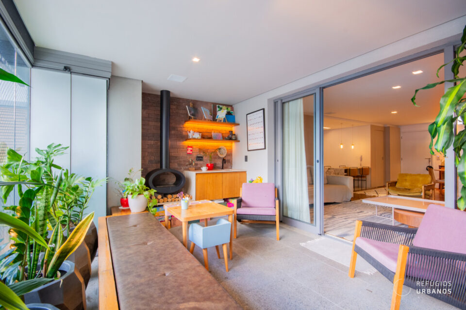 Seguindo em frente, as portas de correr de vidro conduzem à varanda, que se transformou em uma extensão aconchegante da sala, com direito a lareira para os dias mais frios.
