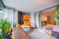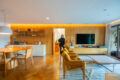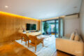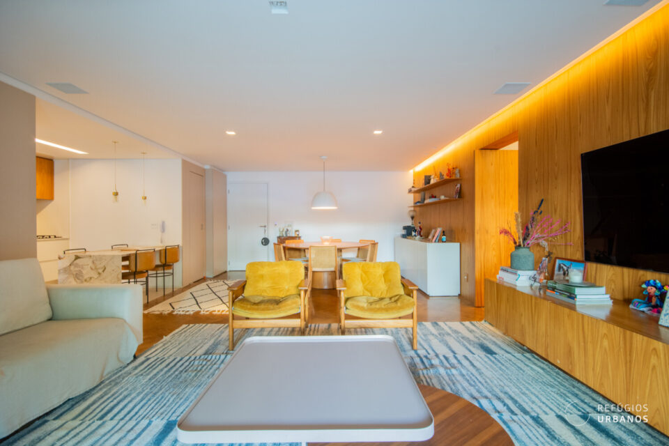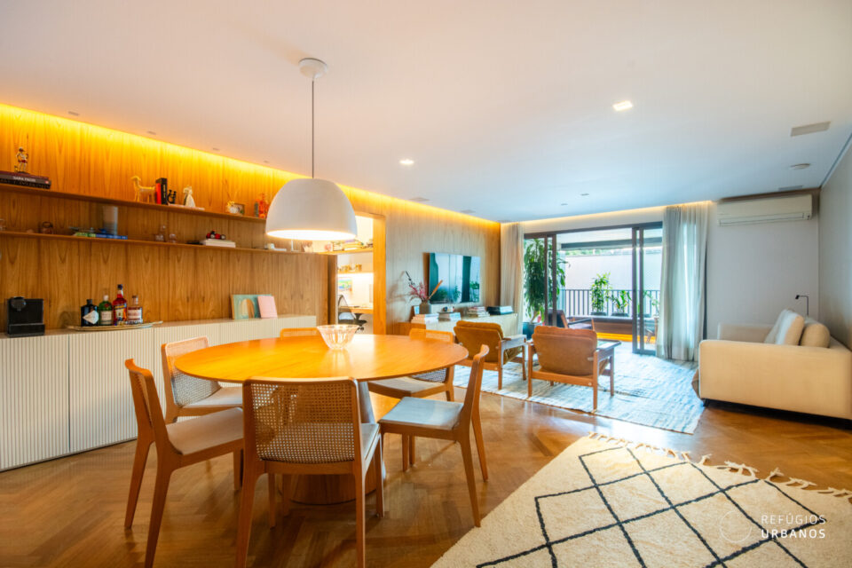Para começar, as salas chamam atenção: totalmente integradas à varanda e a cozinha, oferecem espaço de sobra para os mais diversos usos e arranjos. Um belo painel de madeira separa com elegância a ala íntima da área social.