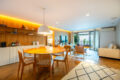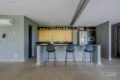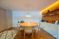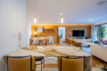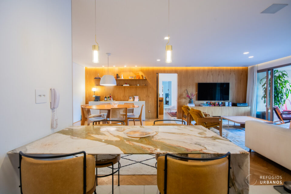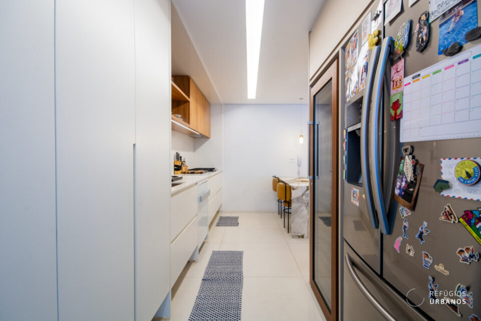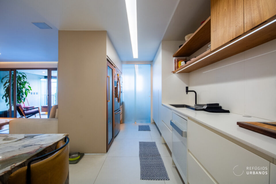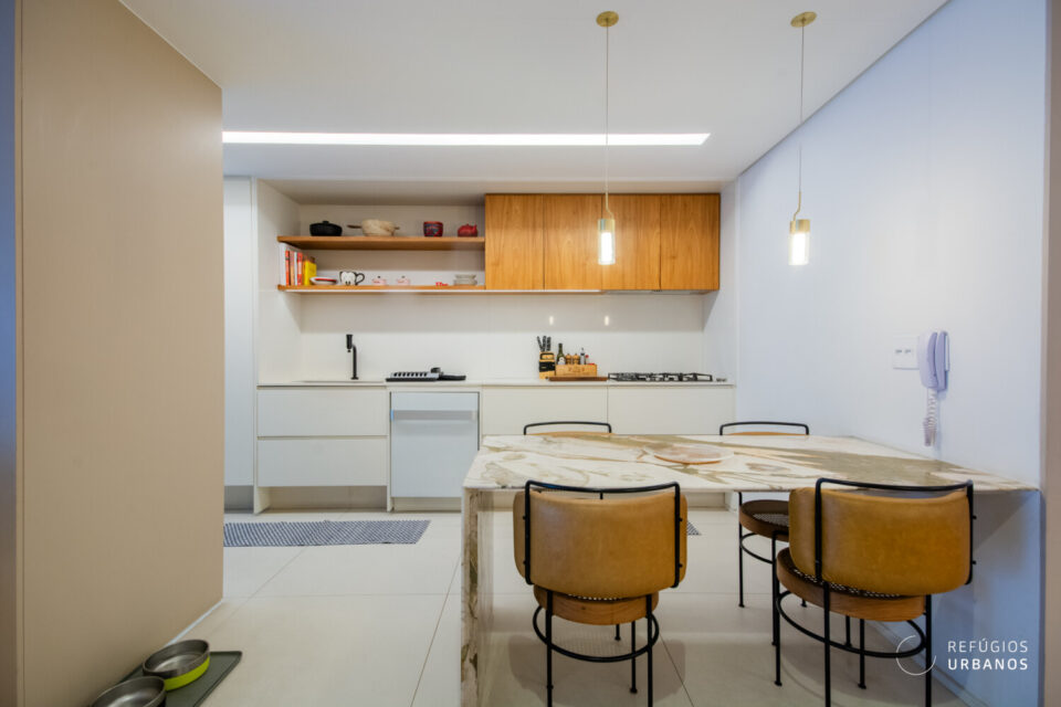 Na sequência, a cozinha, em tons claros, se conecta à sala por meio de uma bancada de mármore deslumbrante. A marcenaria bem planejada garante praticidade no dia a dia, sem abrir mão da estética.