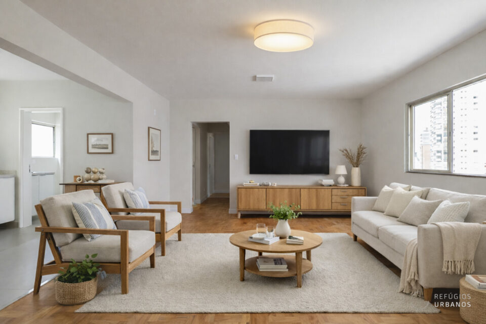 Primeiramente, ao entrar, nos deparamos com uma sala ampla, com muita iluminação natural e ventilação cruzada.