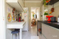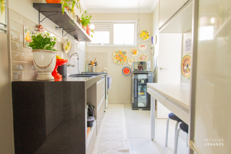 Logo à frente, a cozinha reformada traz revestimentos modernos e marcenaria sob medida. Beleza e funcionalidade caminham juntas aqui.