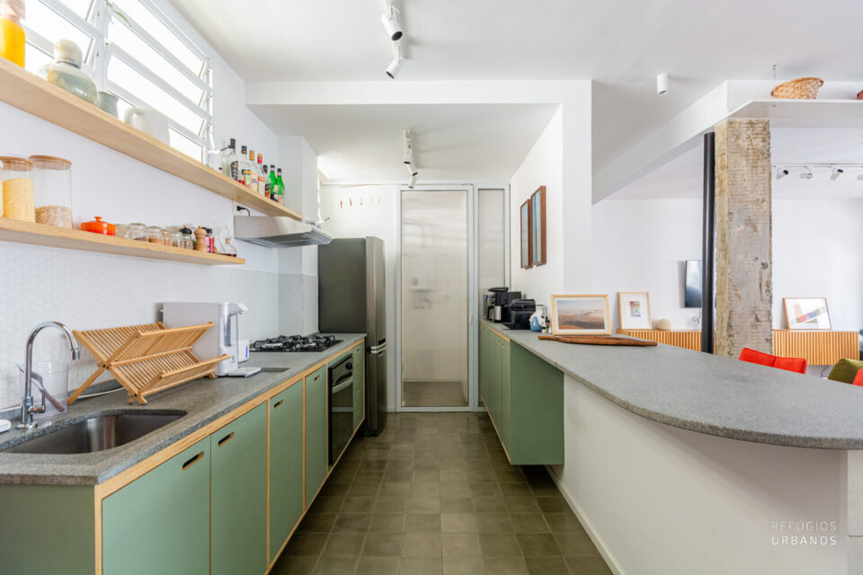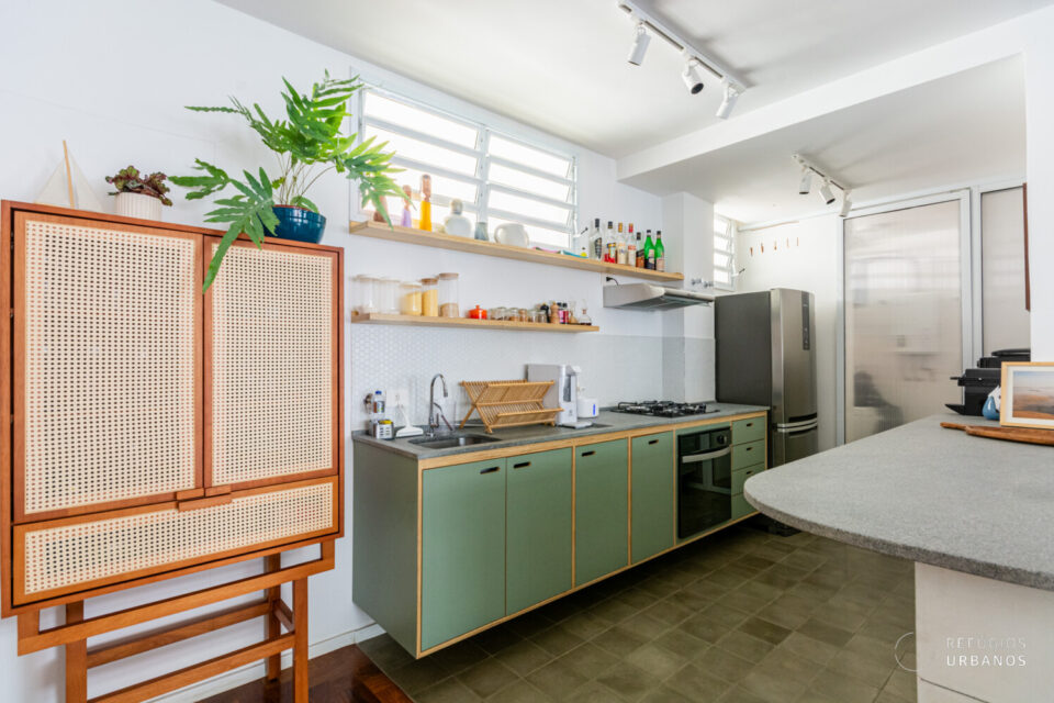 A cozinha conta com bastante marcenaria, uma bancada de apoio para refeições rápidas, além da bancada com a área molhada, cooktop e forno.