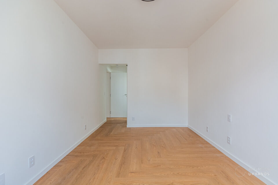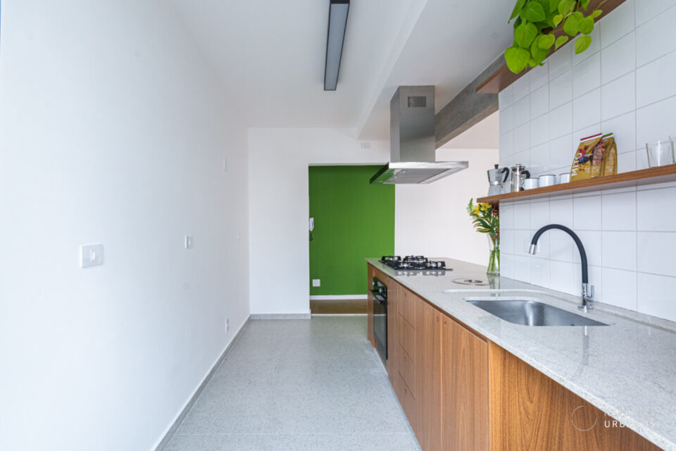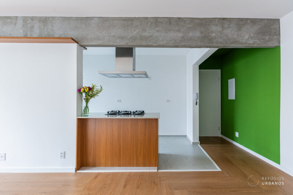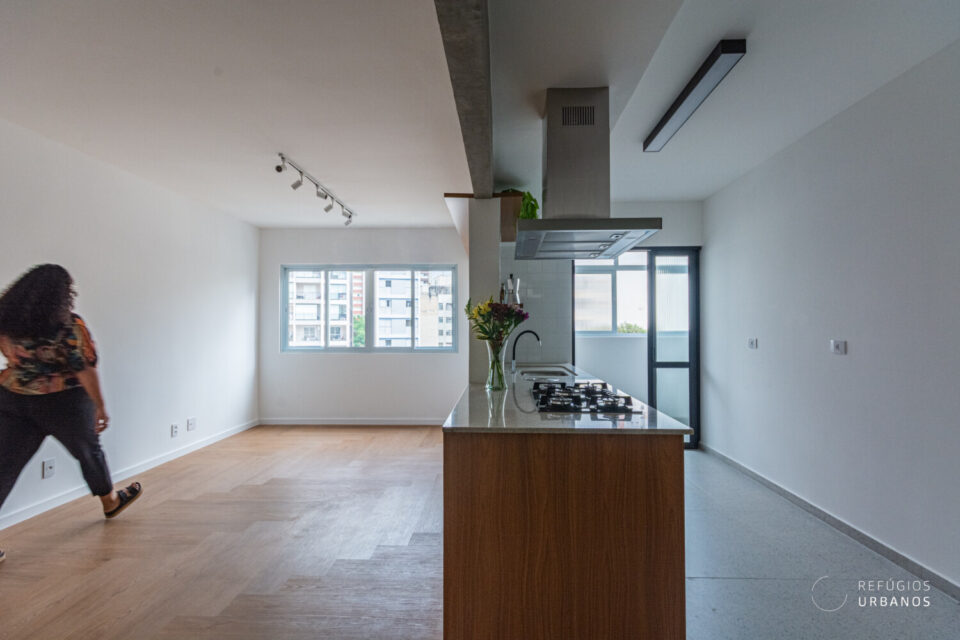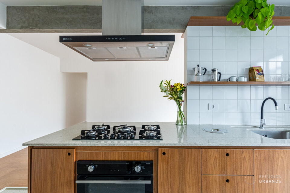 Ele passou por uma reforma completa, tanto na parte elétrica e hidráulica quanto na configuração da planta. O projeto a reorganizou com precisão: demoliu a parede entre a cozinha e a sala, integrando os ambientes, e criando uma bancada com tampo de pedra super confortável para cozinhar. Vale ressaltar que a cozinha já está equipada com eletrodomésticos: coifa de ilha, cooktop cinco bocas e forno.