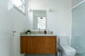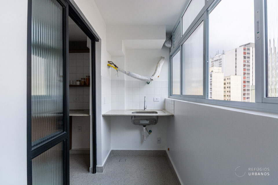 Seguindo adiante, a porta em serralheria e vidro canelado separa a cozinha da “varanderia”, onde há uma bancada generosa com tanque e, além disso, um espaço gostoso que você pode usar até para suas plantinhas. Por sua vez, o local em que antes era o banheiro de apoio atualmente é um cantinho discreto e funcional para a máquina de lavar roupa.