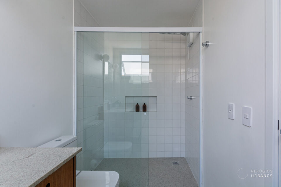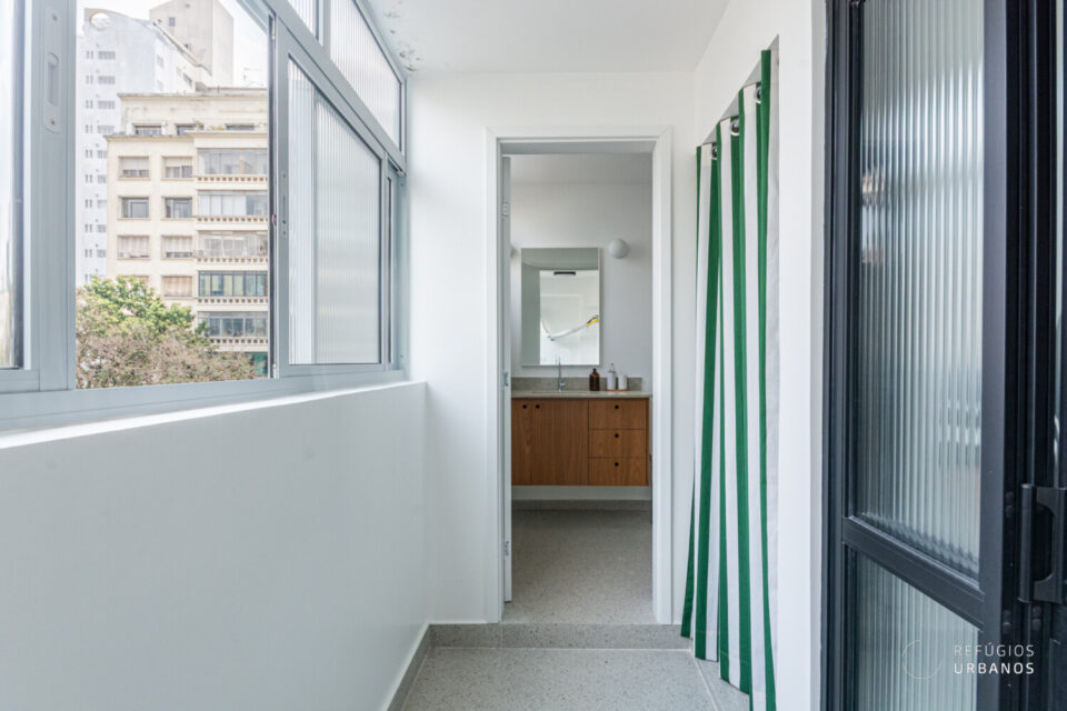 Antigamente só havia um banheiro no apartamento. Aqui, ainda na “varanderia”, tínhamos um quarto de apoio, que foi transformado em um segundo banheiro super espaçoso e charmoso, com ventilação natural.