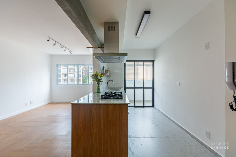 Ele passou por uma reforma completa, tanto na parte elétrica e hidráulica quanto na configuração da planta. O projeto a reorganizou com precisão: demoliu a parede entre a cozinha e a sala, integrando os ambientes, e criando uma bancada com tampo de pedra super confortável para cozinhar. Vale ressaltar que a cozinha já está equipada com eletrodomésticos: coifa de ilha, cooktop cinco bocas e forno.