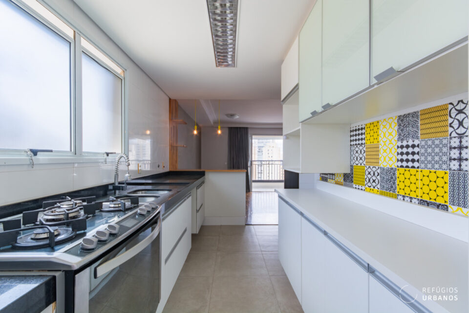 Cozinha super iluminada e com bastante área de balcão e armários.