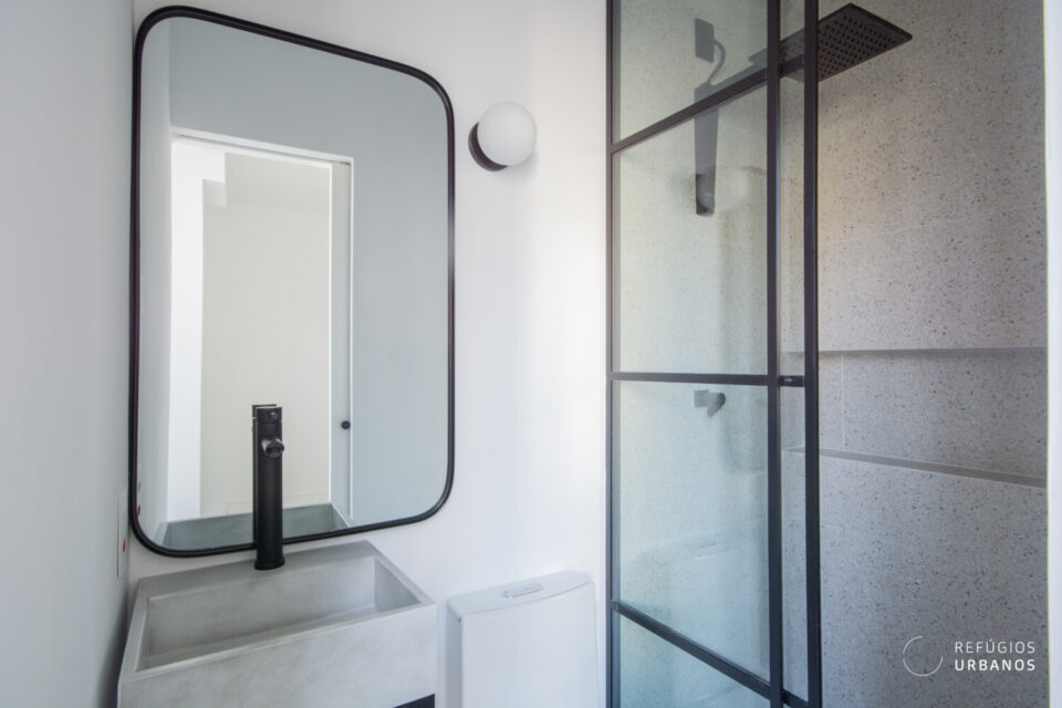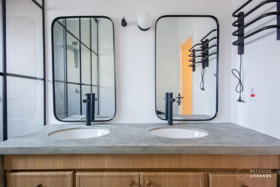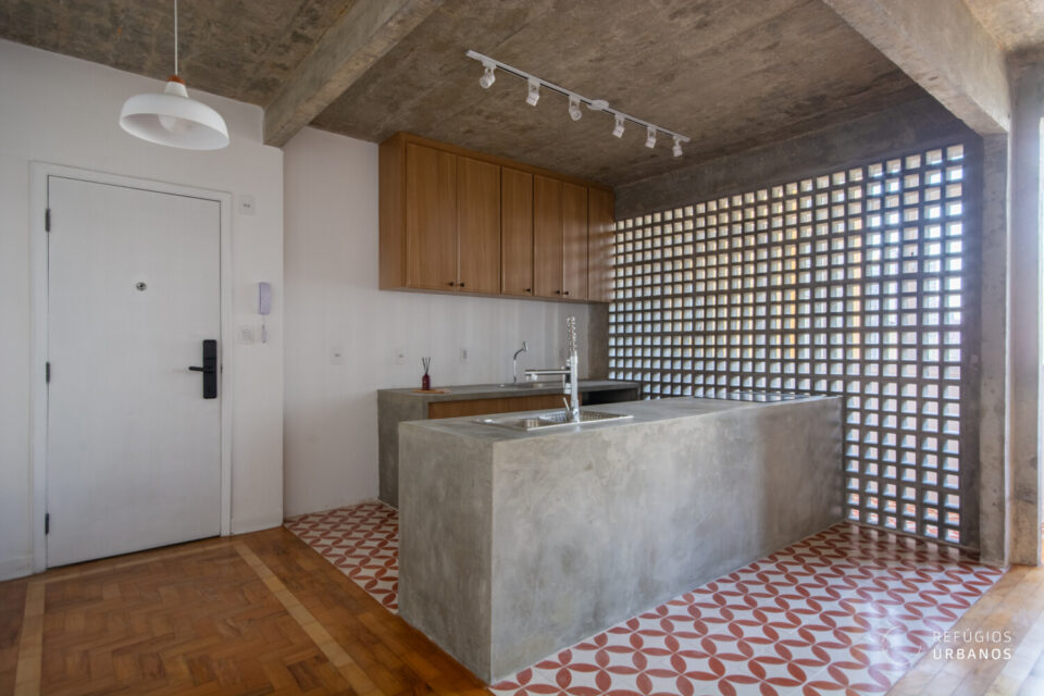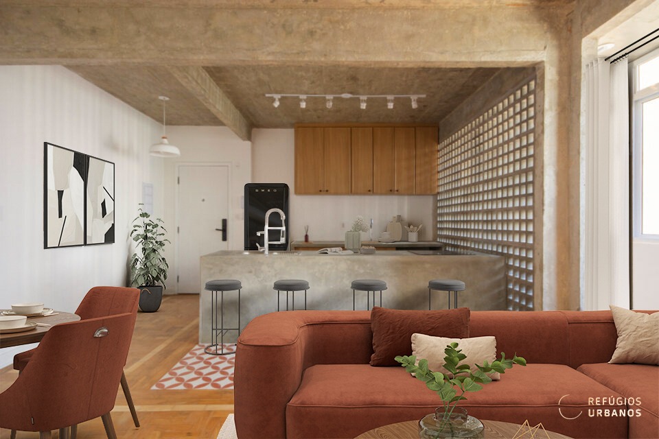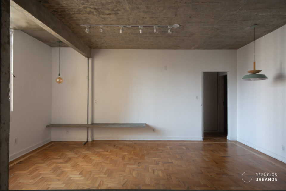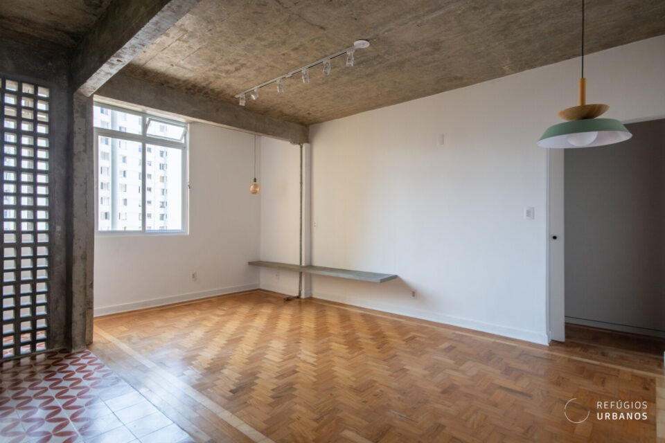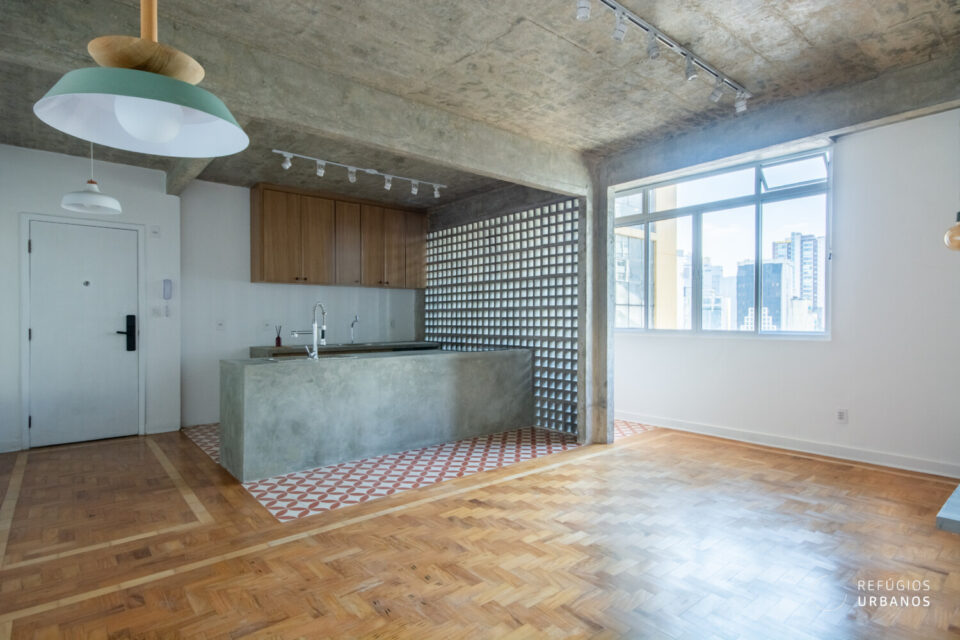 Mas o que realmente torna esse apartamento especial é a combinação perfeita entre o charme do passado e a modernidade do presente. O chão de taco original foi preservado, enquanto as áreas molhadas ganharam um toque de elegância com o piso hidráulico.