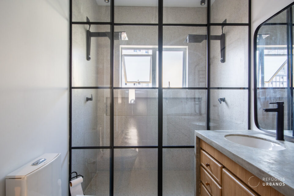 O apartamento é um verdadeiro refúgio, com duas suítes confortáveis, cada uma com seu próprio banheiro completo.