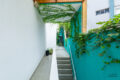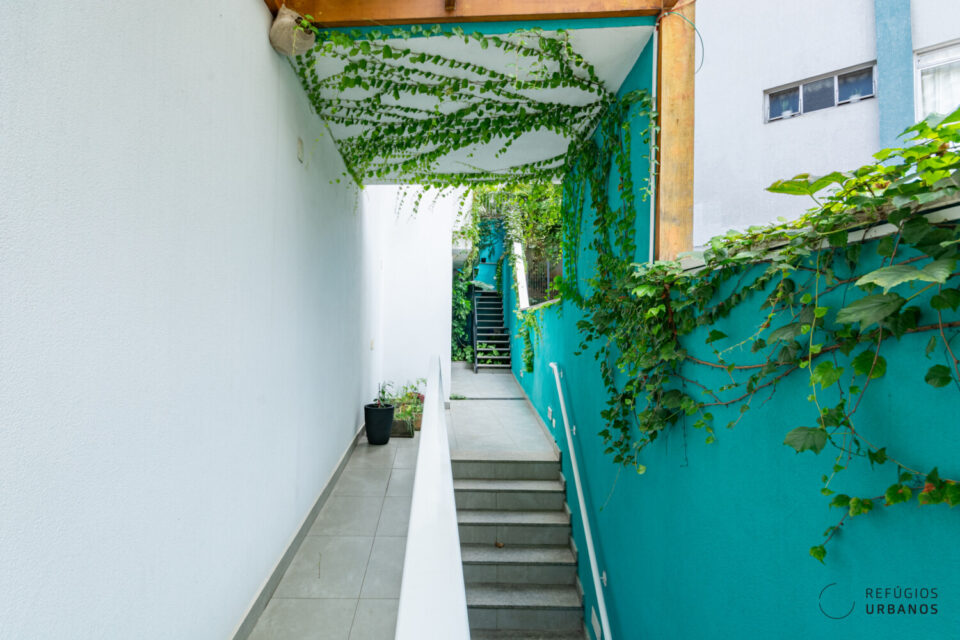 Subindo as escadas a partir da rua encontramos o corredor lateral que percorre o terreno e também dá acesso à varanda.  Esse imóvel está um pavimento acima da garagem e, por isso, é muito iluminado e ventilado.