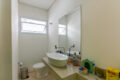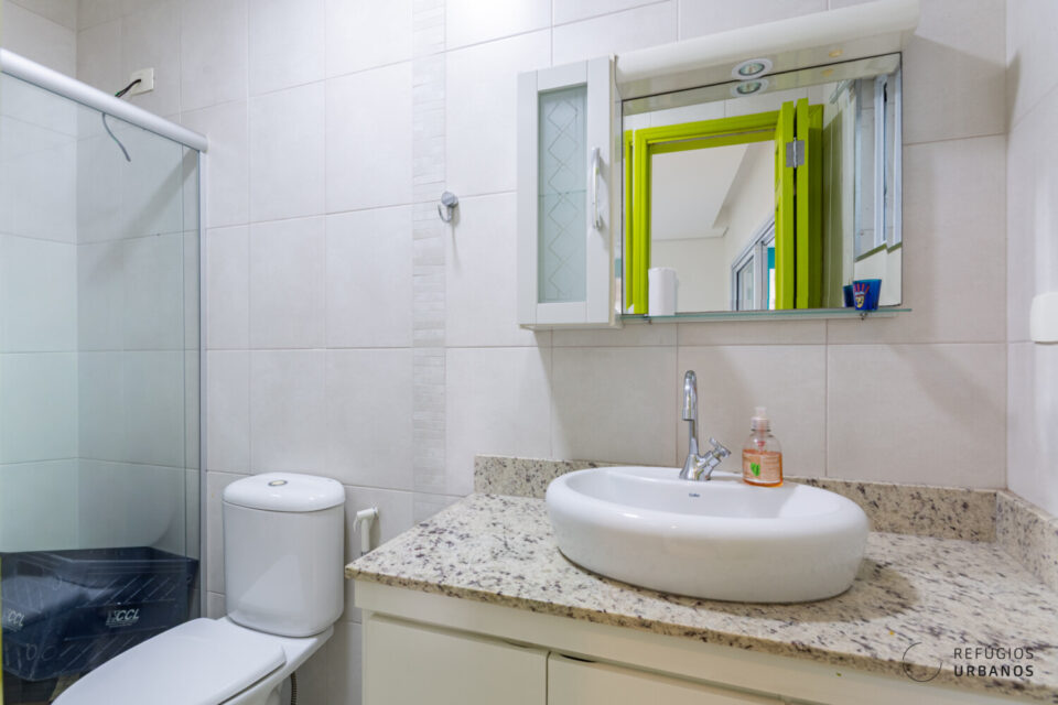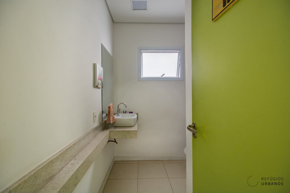 Um corredor nos leva a mais um lavabo, um banheiro completo e ao segundo quarto, voltado para a frente da casa e com um delicioso janelão na altura das árvores. Sim, aqui também já há ar condicionado.
