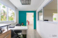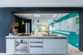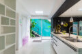 Aqui cozinha e sala estão integradas e portas de correr se abrem para a varanda, com um pergolado. O ar condicionado já está instalado, assim como forno e cooktop. Esse espaço é ideal para ter sofá, painel de TV, mesa de jantar para receber família e amigos. Ainda neste andar temos uma despensa e dois lavabos – um deles que pode facilmente ser transformado em uma lavanderia fechada.