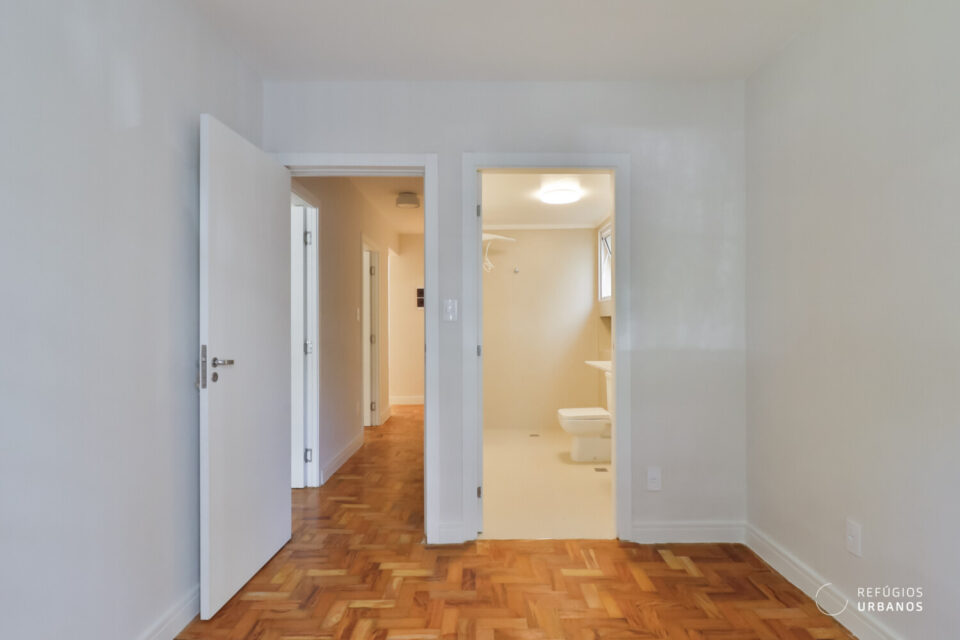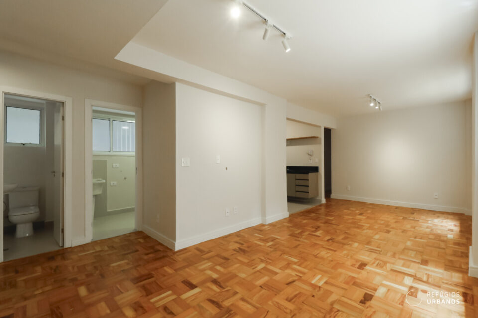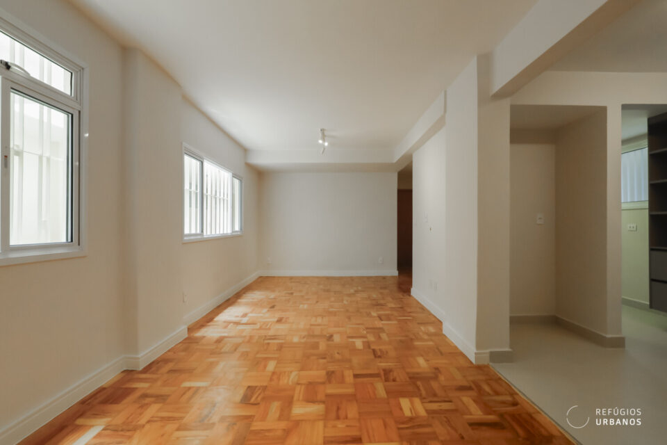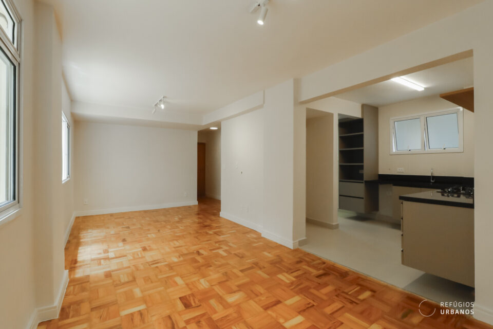 O piso de taco de madeira restaurado preserva o charme original do imóvel. Ao mesmo tempo, as novas instalações elétricas e hidráulicas garantem segurança e conforto, criando um encontro perfeito entre o antigo e o novo.