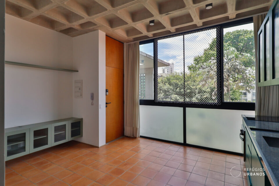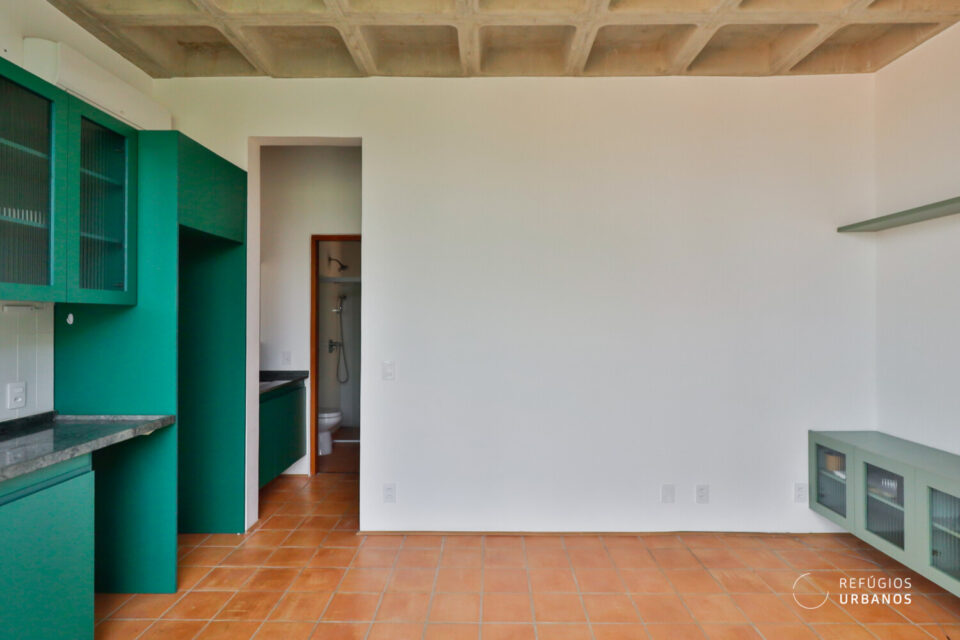 - Piso cerâmico e teto em concreto aparente em toda a unidade;