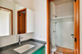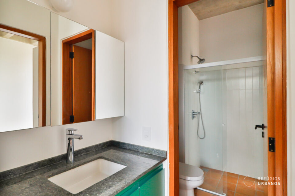 Vale destacar ainda o fato de que a pia fica fora da parte reservada, o que faz as vezes de um semi lavabo para as visitas.
