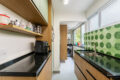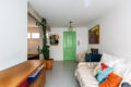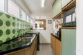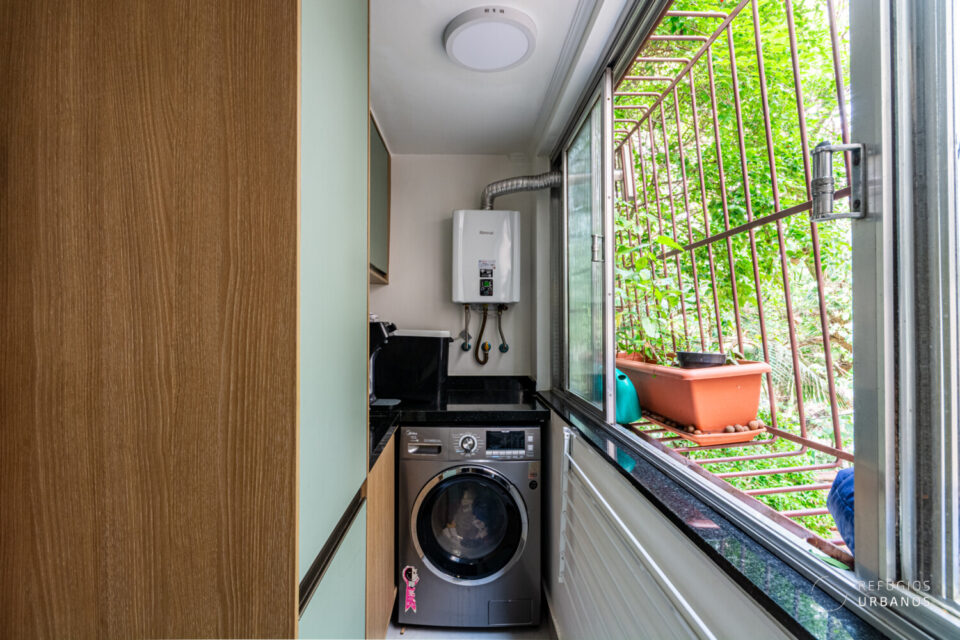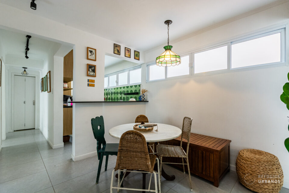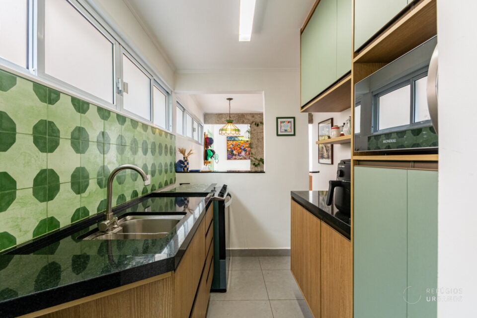 Aliás, a cozinha também passou por repaginação com marcenaria novinha, a criação de uma área de lavanderia e o detalhe do ladrilho hidráulico verde sobre a pia. Vale destacar que as janelas em toda a extensão garantem ventilação e luminosidade.