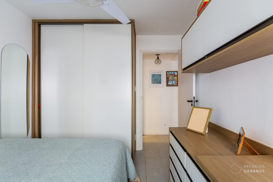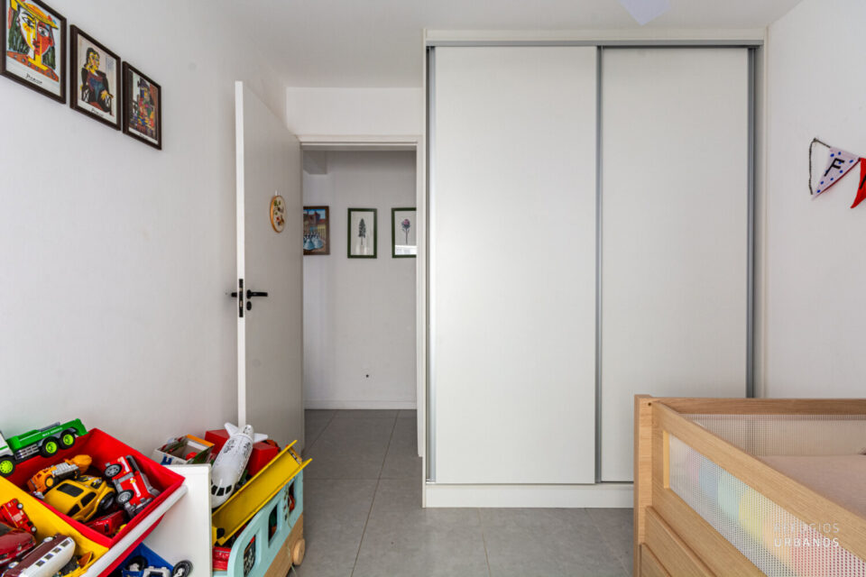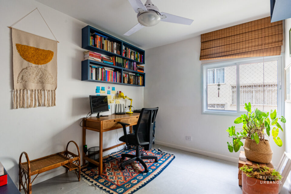Na parte íntima, os dormitórios têm boa metragem. Dois deles, por exemplo, já contam com armários, e o terceiro funciona hoje como escritório.