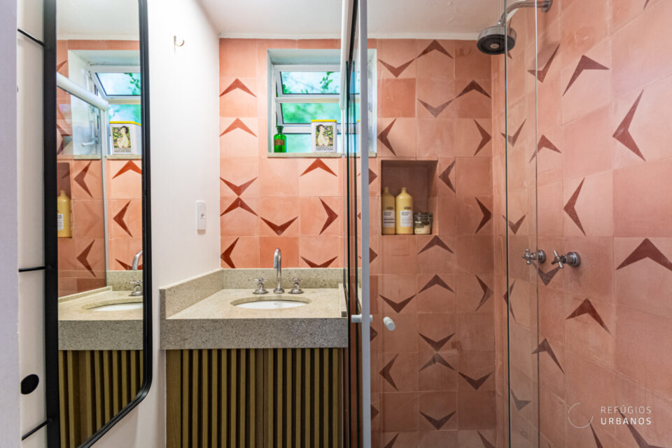 Um banheiro completo, com chuveiro a gás atende os quartos e também tem seu charme com ladrilhos hidráulicos e marcenaria ripada.