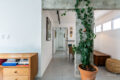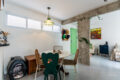 São três quartos bem distribuídos, com muita luz natural, além disso, há uma sala de estar semi-integrada. Dessa forma, foi criado um ambiente ideal para a mesa de jantar, que fica envolta em colunas com concreto aparente e, ainda assim, conectada com a área de estar e cozinha.