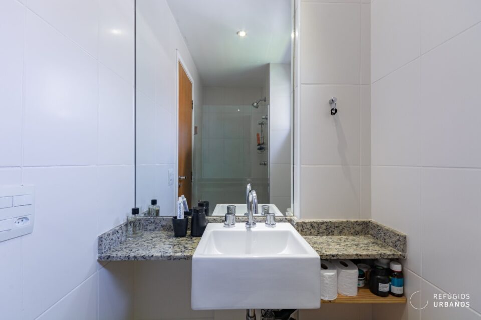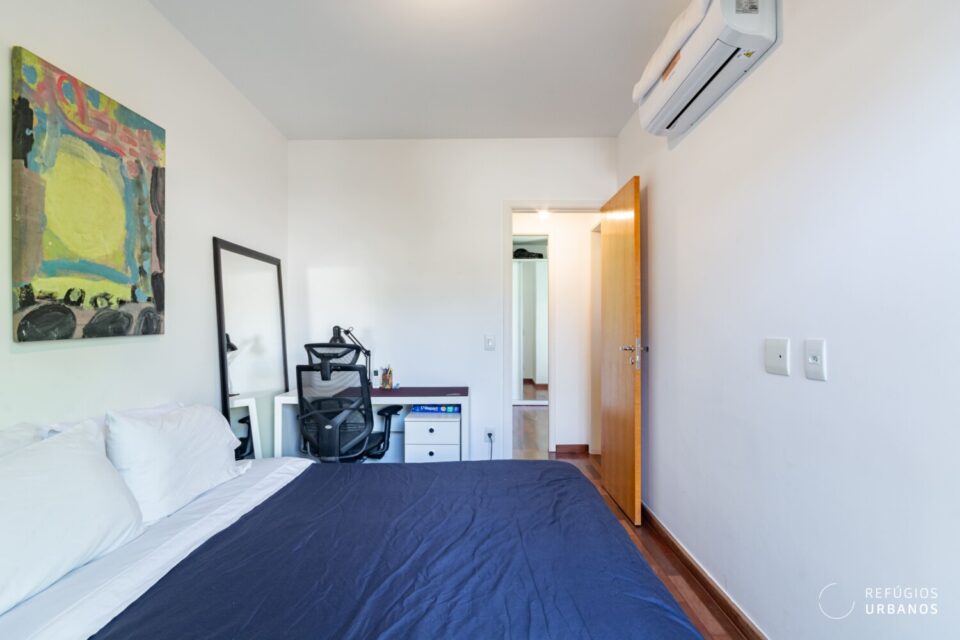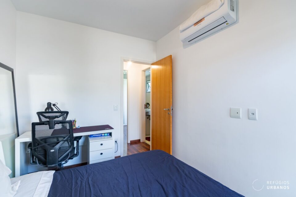 O segundo dormitório funciona perfeitamente como escritório ou quarto de apoio. Além disso, um banheiro social completo atende esse ambiente com facilidade.