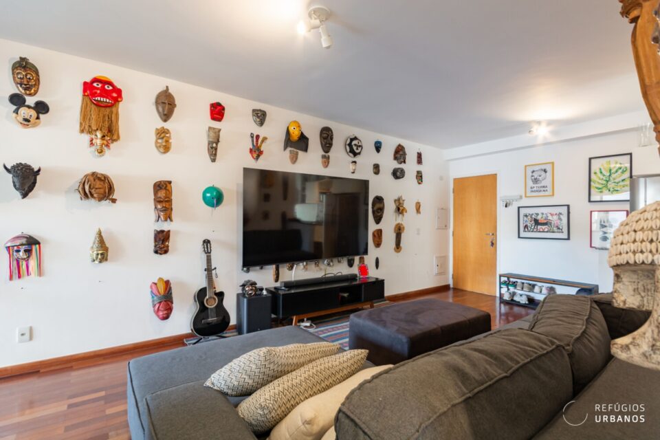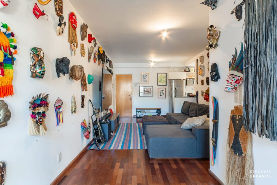 A planta original foi mantida, porém muito bem resolvida. A sala se integra com a cozinha, que também conversa com a área de serviço. Dessa forma, os espaços ficam mais fluidos e funcionais.