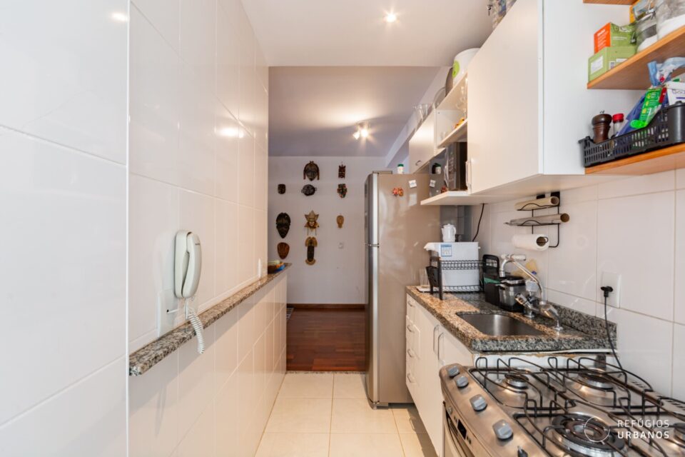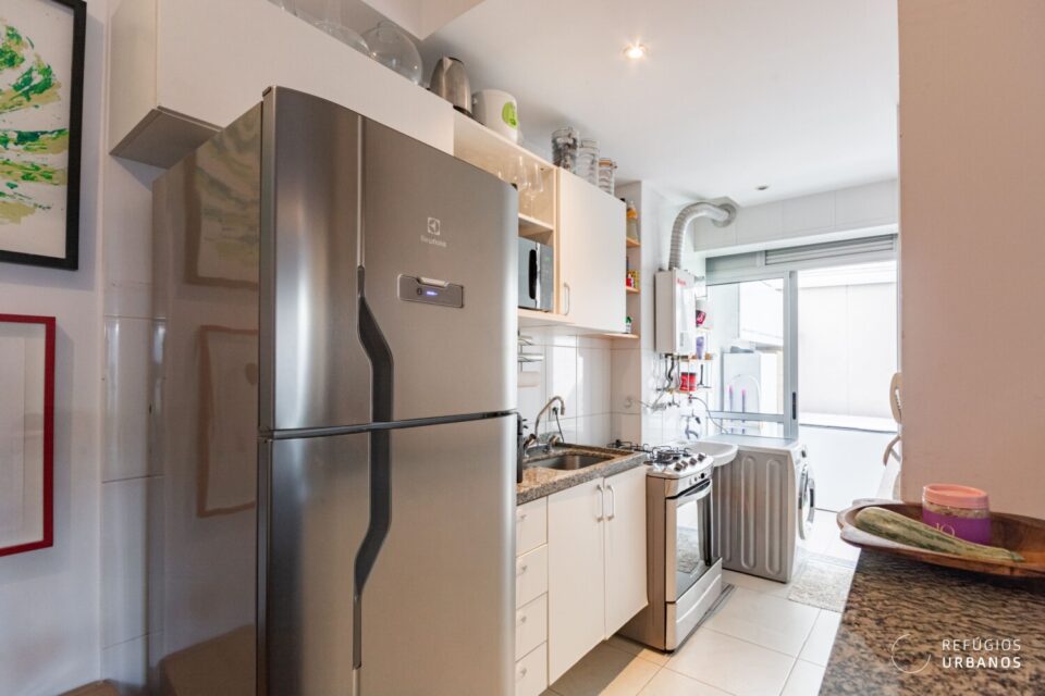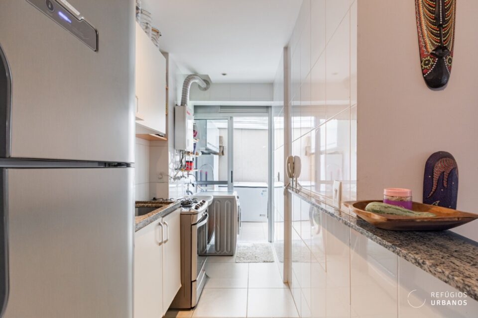 A cozinha é iluminada e ventilada naturalmente. As marcenarias brancas, por sua vez, trazem leveza e permitem diversas possibilidades de personalização.