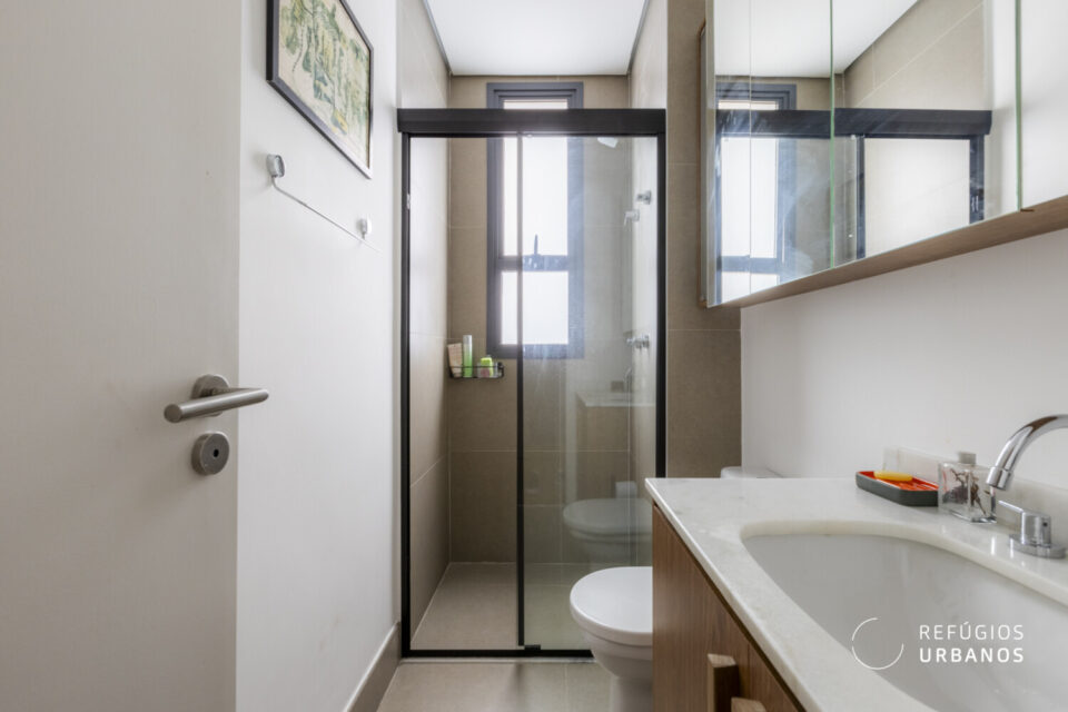 Na área íntima, duas suítes ventiladas e iluminadas completam o apartamento: uma suíte de casal, com banheiro confortável e ventilação natural, e uma suíte de solteiro.