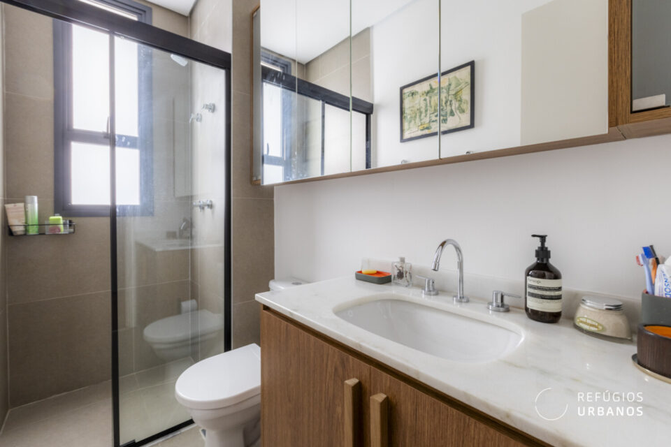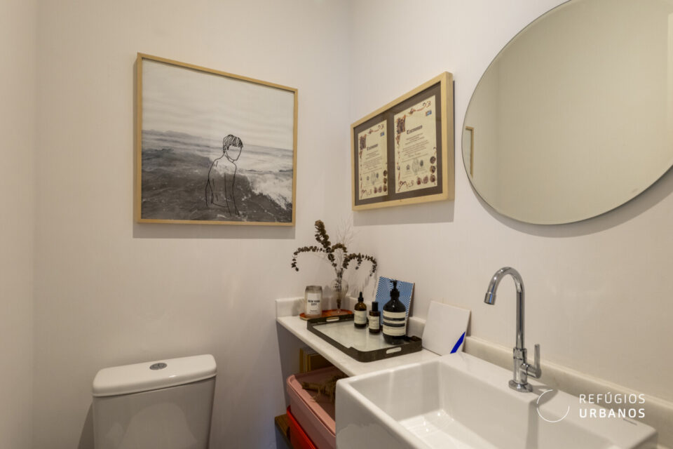 O lavabo apoia a área social, e a lavanderia oferece espaço amplo e funcional.