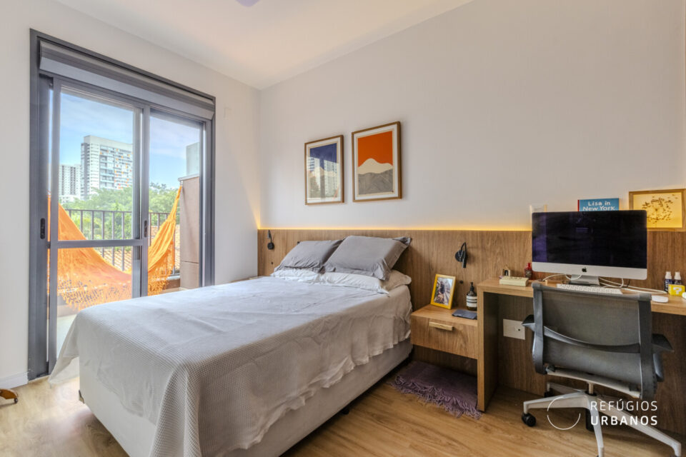 Ambas possuem amplas portas duplas de correr voltadas para o terraço, garantindo excelente iluminação natural. Além disso, a marcenaria de excelente qualidade otimiza todos os cantos dos quartos.