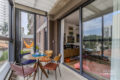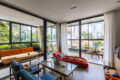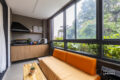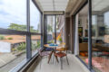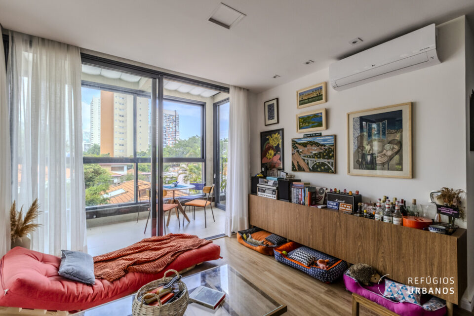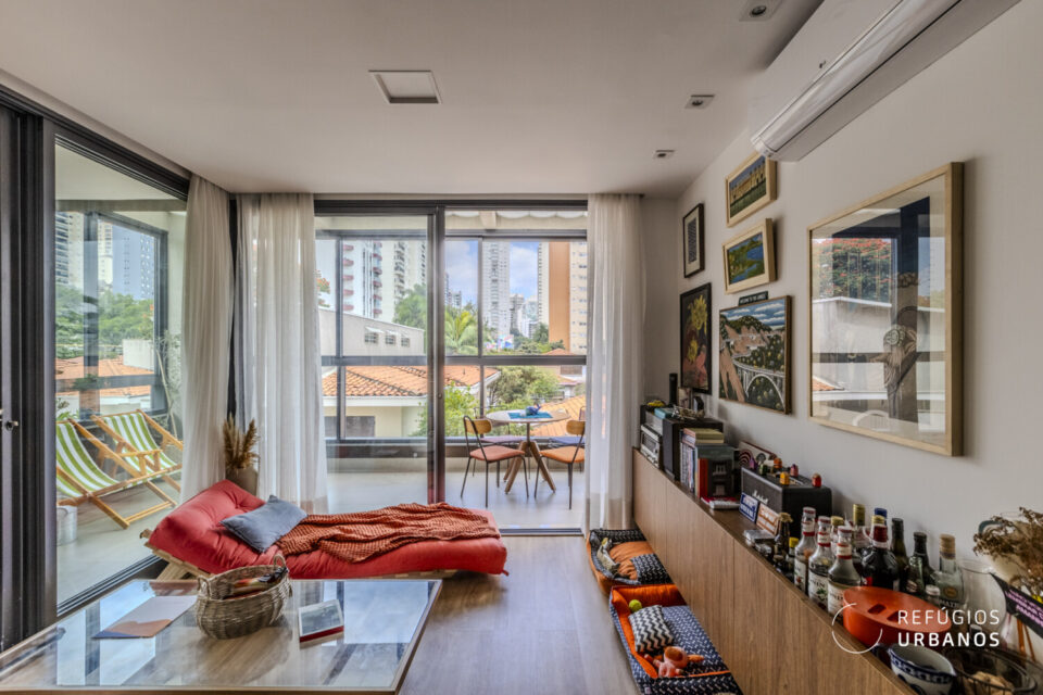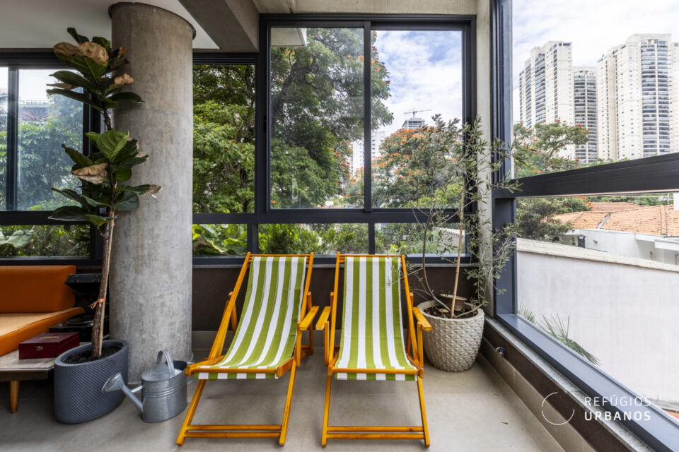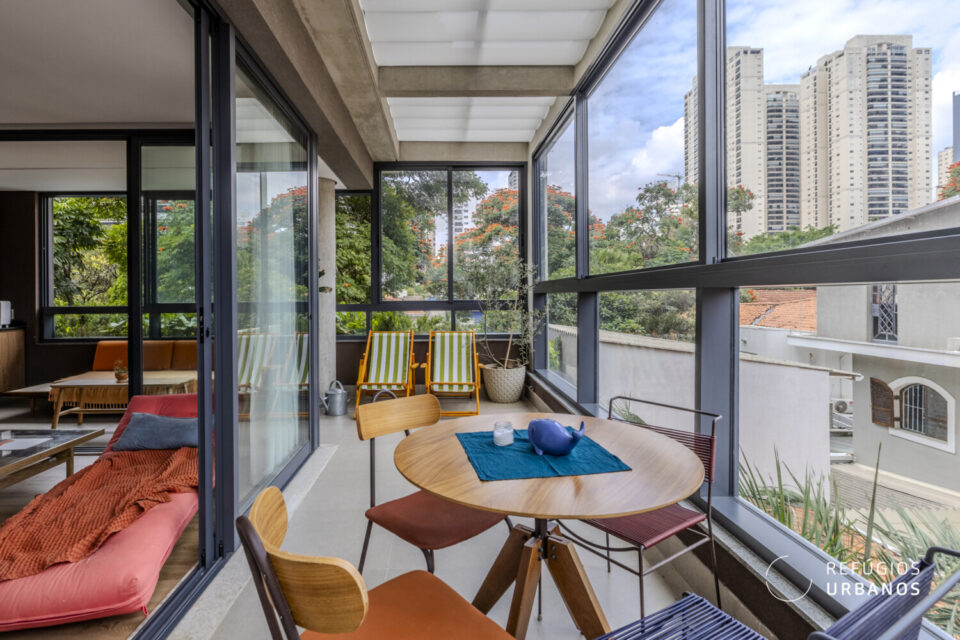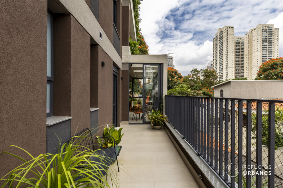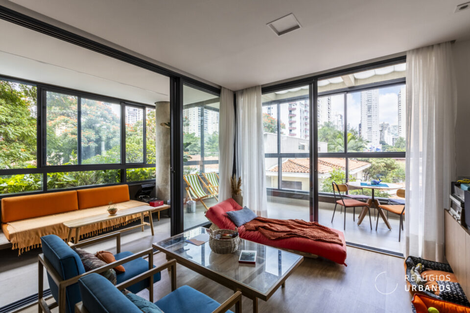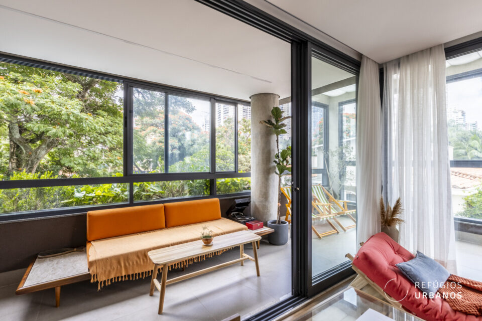A área externa envolve todo o apartamento e oferece uma deliciosa vista verde. O varandão percorre o imóvel de ponta a ponta e, aliado ao pé-direito alto e às vidraças do piso ao teto, amplia significativamente a sensação de espaço.