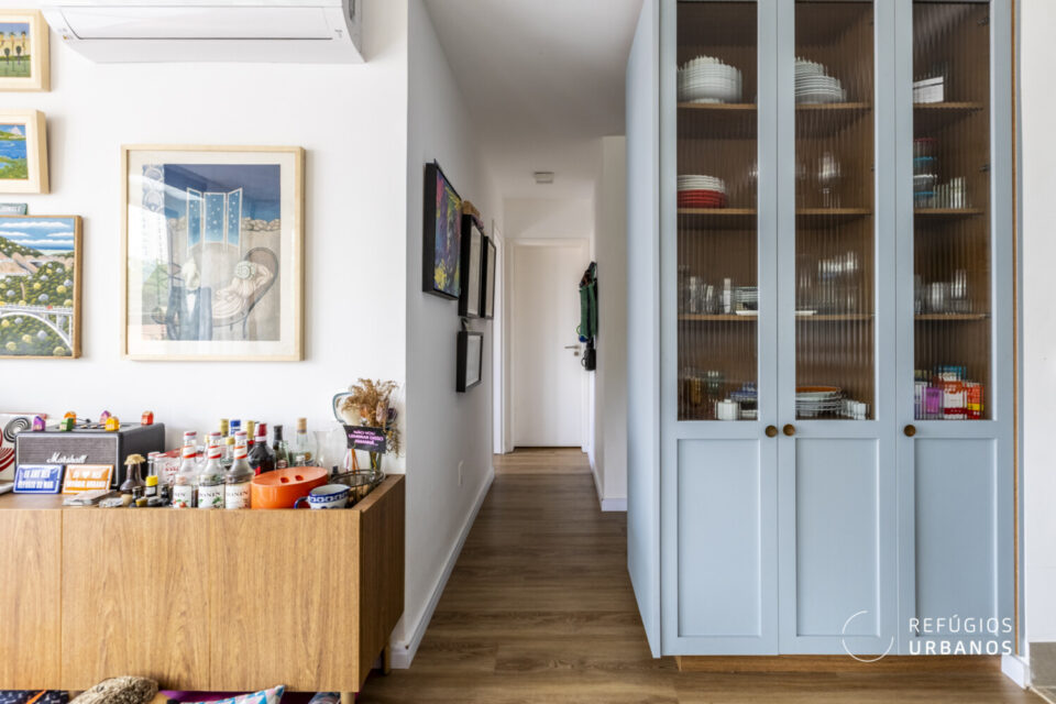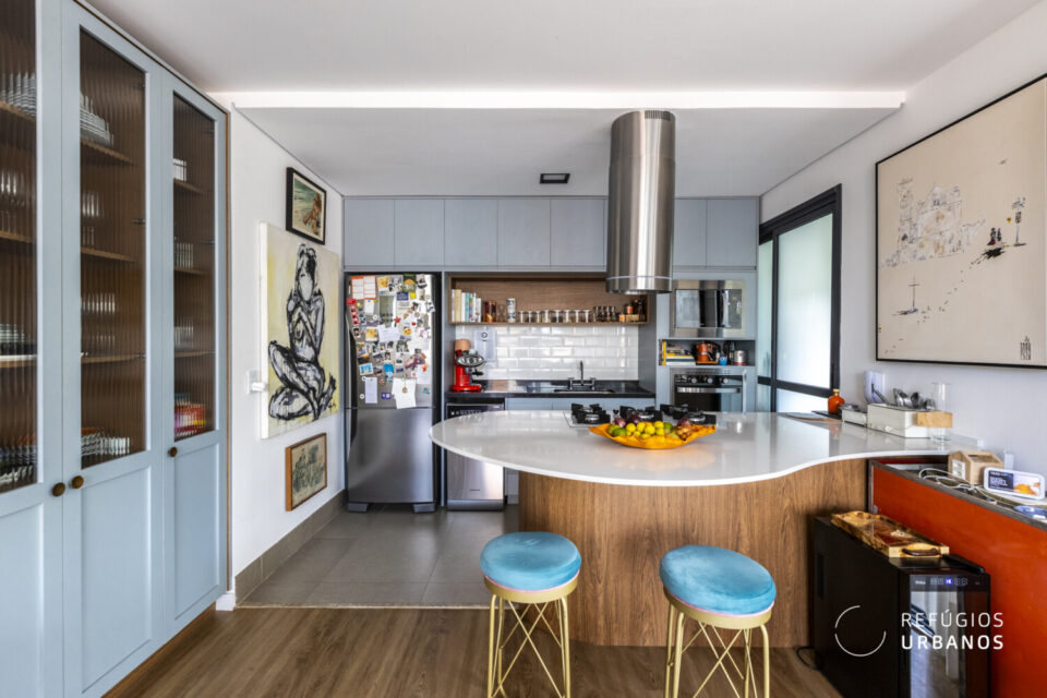 A marcenaria, em tons de azul-claro, contrasta elegantemente com a madeira e oferece estrutura ideal para dias de master chef. É perfeita para quem gosta de viver bem e receber família e amigos.