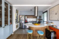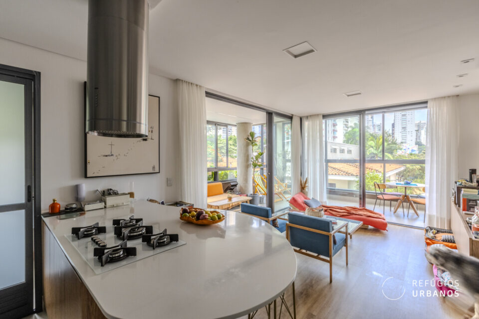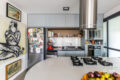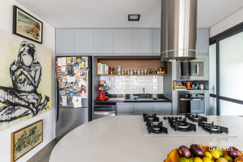 A cozinha, por sua vez, destaca-se no projeto. Com muito estilo, ela valoriza o conjunto e torna os ambientes ainda mais charmosos, tanto internamente quanto na conexão com a área gourmet.