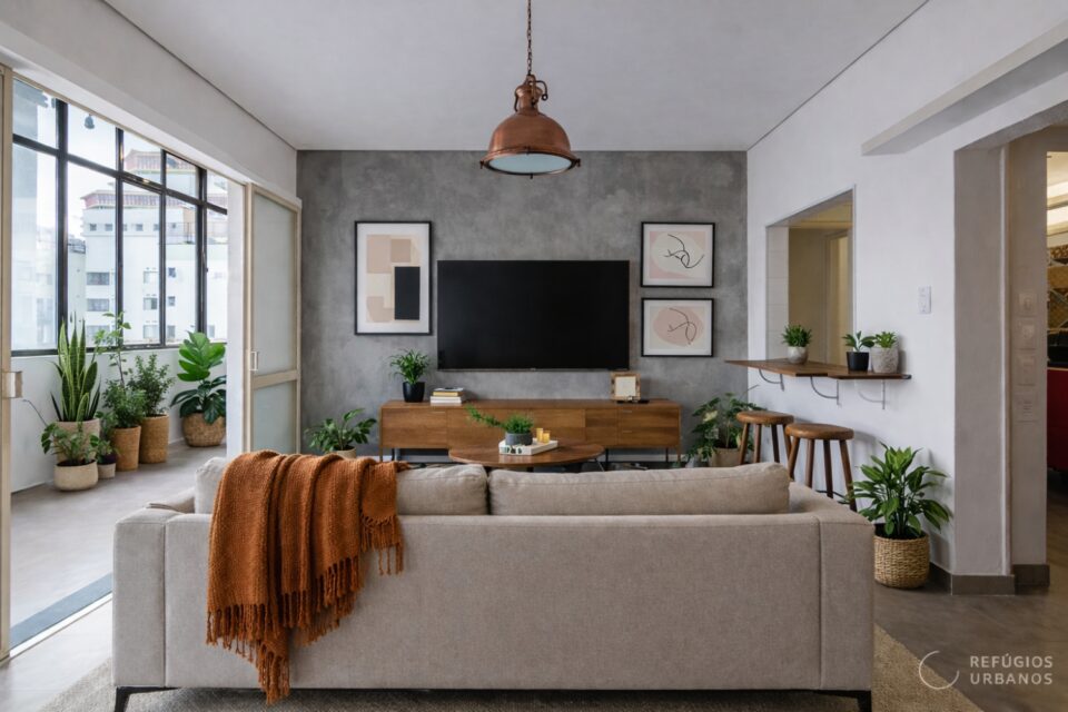 Primeiramente, ao entrar, nesse apê na Bela Vista, um hall acolhedor conduz à área social, onde a cozinha semi- integrada se conecta harmoniosamente à sala.