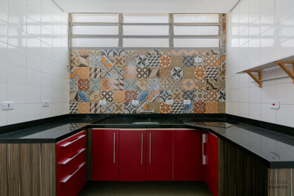 A cozinha encanta com sua combinação de cores vibrantes e azulejos decorativos, criando um ambiente charmoso e cheio de personalidade, com uma espaçosa bancada e marcenaria planejada, que otimizam o espaço e o mantém organizado.