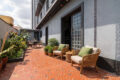 A sensação de aconchego acontece já logo no quintal, com o piso de caquinhos e um canteiro de flores, que deixa o ambiente perfeito para colocarmos uma cadeira de praia e descansar.