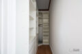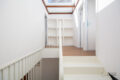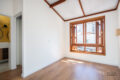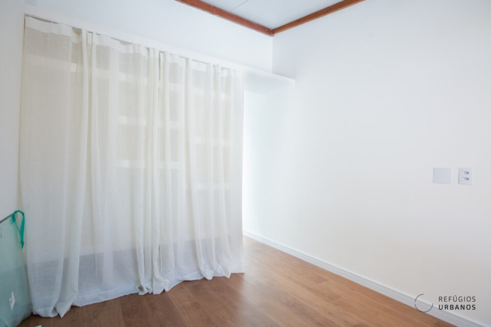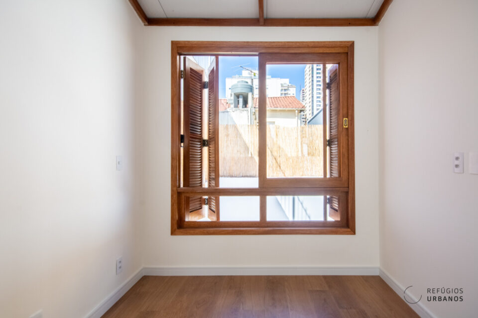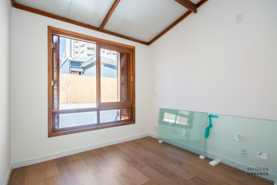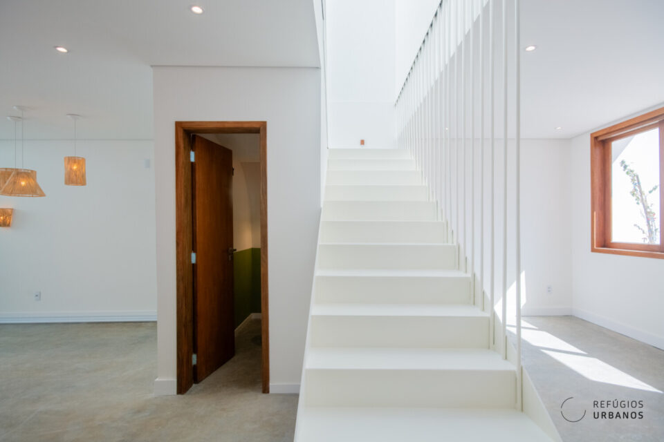 Subindo pela elegante escada, o charme continua. Uma claraboia central ilumina o hall íntimo, onde uma estante pode servir de biblioteca, galeria de arte ou espaço decorativo. A planta surpreende ao oferecer três suítes confortáveis, todas com esquadrias sob medida em madeira e venezianas.