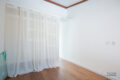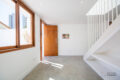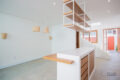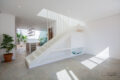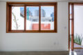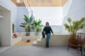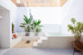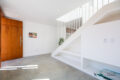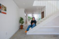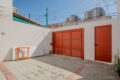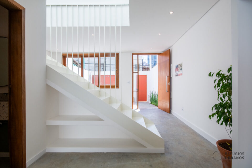 O portão em chapa metálica terracota faz bonito contraste com a fachada branca e as esquadrias de madeira, criando uma primeira impressão marcante. Logo na entrada, a garagem acomoda confortavelmente um carro grande, uma moto ou bicicleta, além de oferecer acesso ao corredor principal.
