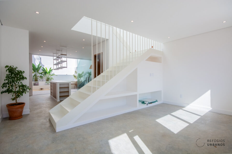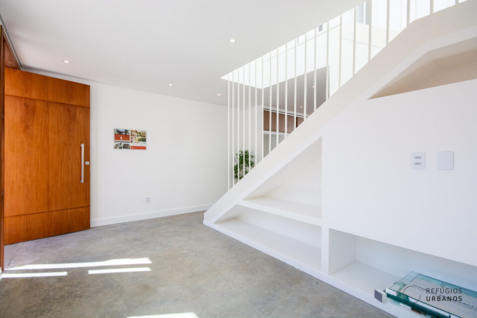 Antes de chegarmos ao quintal, vale destacar alguns detalhes da área social. Na sala de estar, a arquiteta aproveitou o espaço sob a escada para criar um nicho decorativo e funcional para a TV. A escada, por sua vez, delimita sutilmente os ambientes e conduz o olhar até a cozinha.
