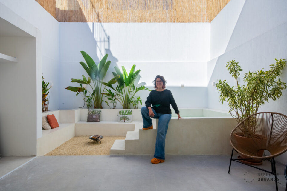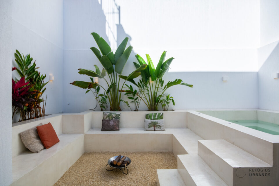 Ao atravessar as portas de vidro, chega-se ao quintal dos sonhos. Embora o piso interno seja de cimento queimado, aqui optou-se por um porcelanato resistente que mantém a mesma estética. A piscina, com hidromassagem, rouba a cena. Ao lado dela, um banco de alvenaria forma um pátio aconchegante — ideal para dias ensolarados ou noites ao ar livre.