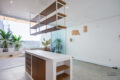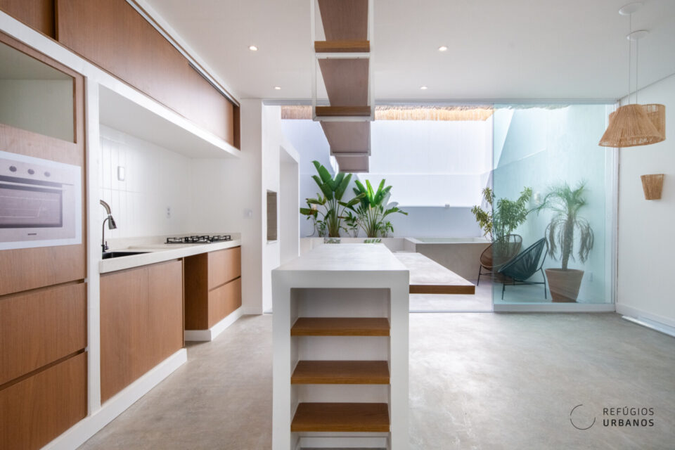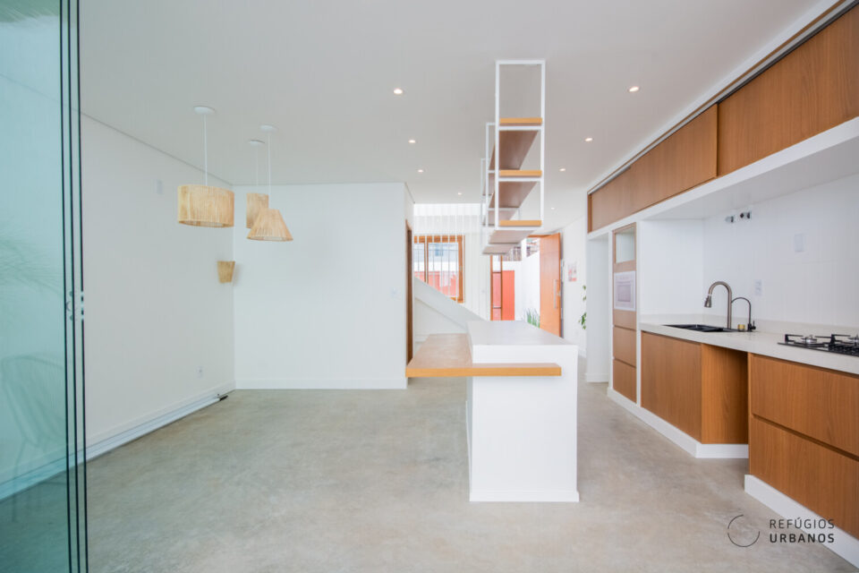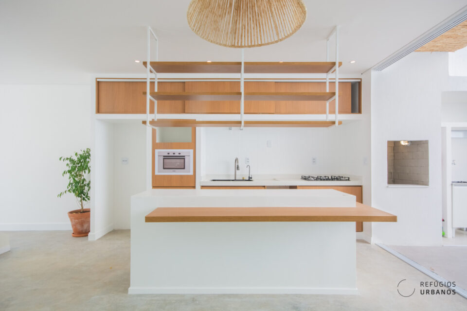 A ilha central, com marcenaria sob medida e prateleiras de serralheria e madeira, se torna o ponto de encontro perfeito para receber família e amigos. A bancada da pia, em silestone branco, acrescenta sofisticação. Do outro lado, a sala de jantar comporta confortavelmente uma mesa para até oito lugares.