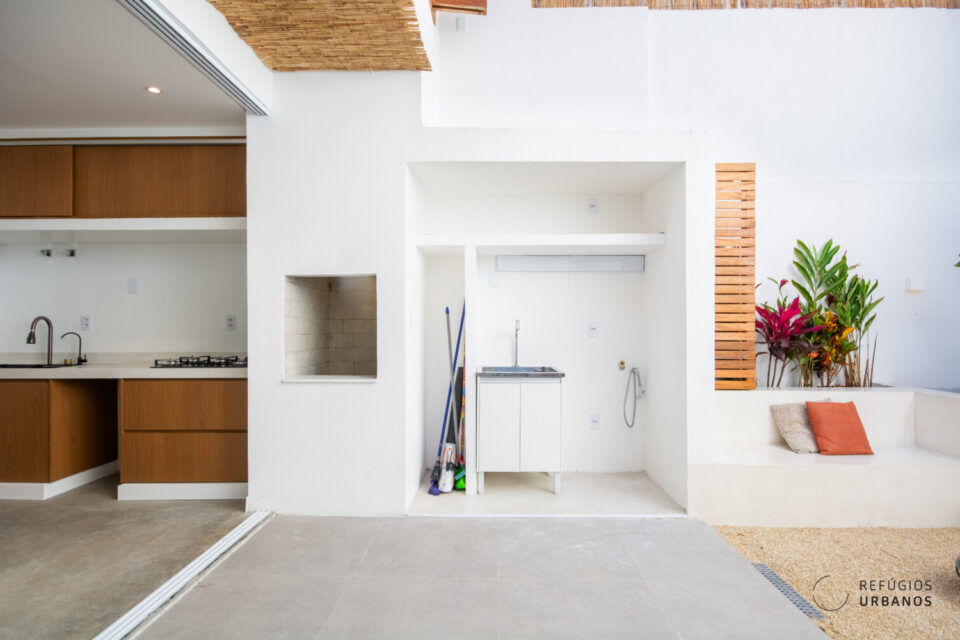 A churrasqueira completa esse combo infalível. E, para manter tudo em ordem, há uma área de serviço discretamente posicionada atrás de uma porta de serralheria, equipada com varal retrátil e espaço para armazenagem.