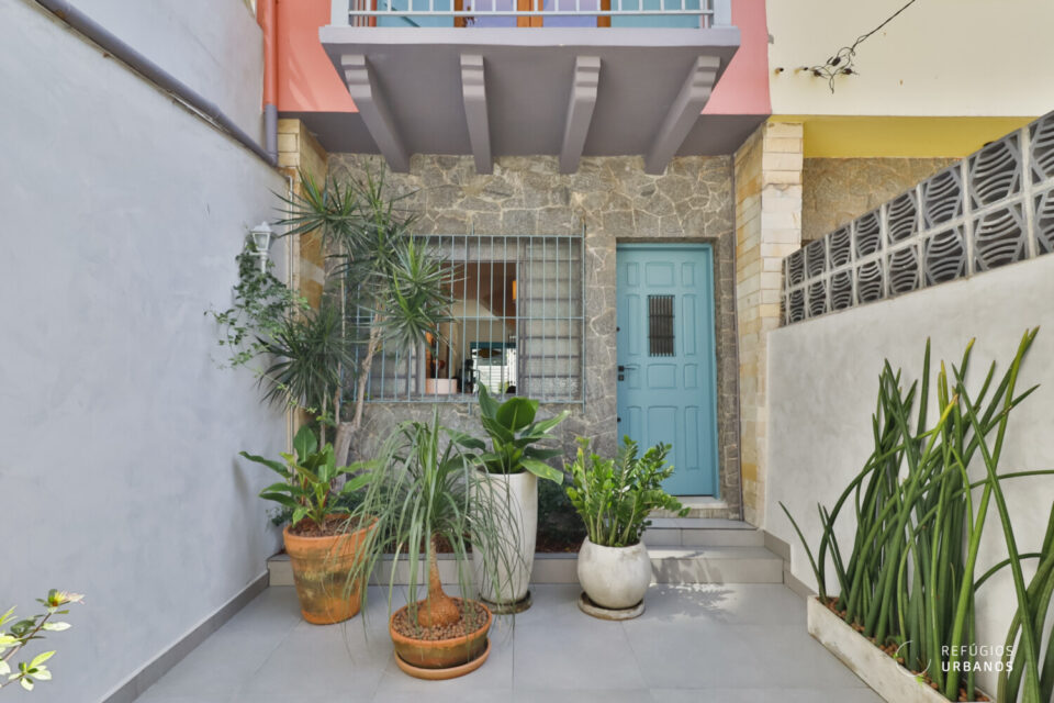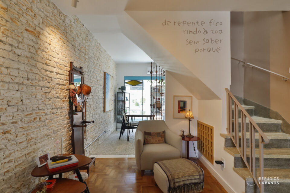 Ao abrirmos a porta, percebemos estar em um lugar especial: o piso de taquinhos impecável, parede de tijolinhos e a escada de granilite fazem nossos olhos brilharem. Puro encanto!