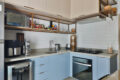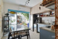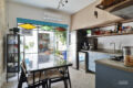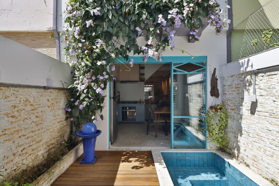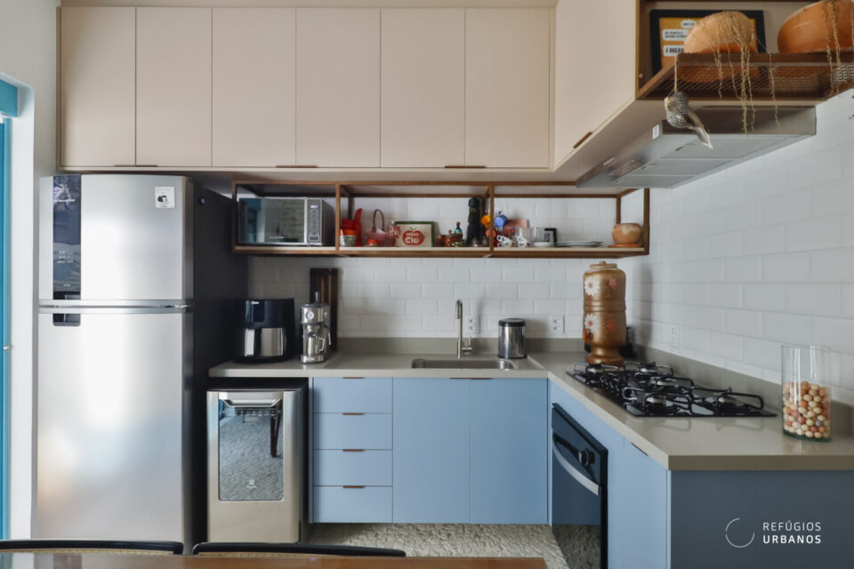 Uma porta de correr em serralheria azul, maravilhosa, delimita a cozinha e o quintal. Além disso, deixa os espaços com uma comunicação visual incrível.