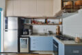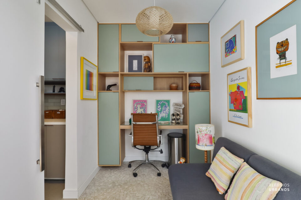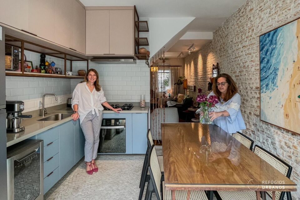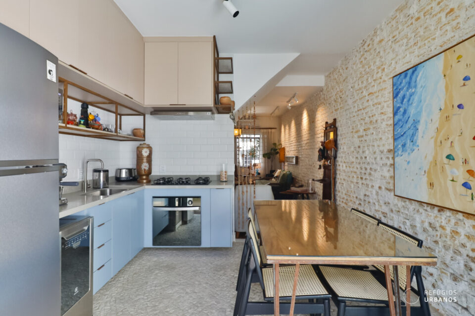 Aqui, a sensação é de funcionalidade e fluidez é feita através da harmonia visual entre os ambientes e do aproveitamento da luz natural. Fora isso, a marcenaria sob medida e o piso de pedra portuguesa dão mais charme ao espaço.