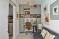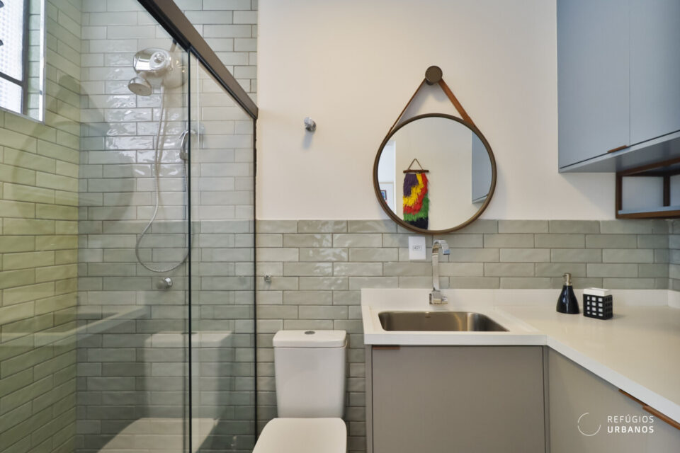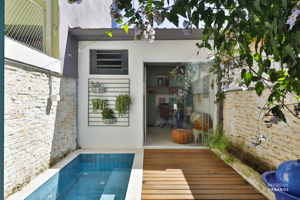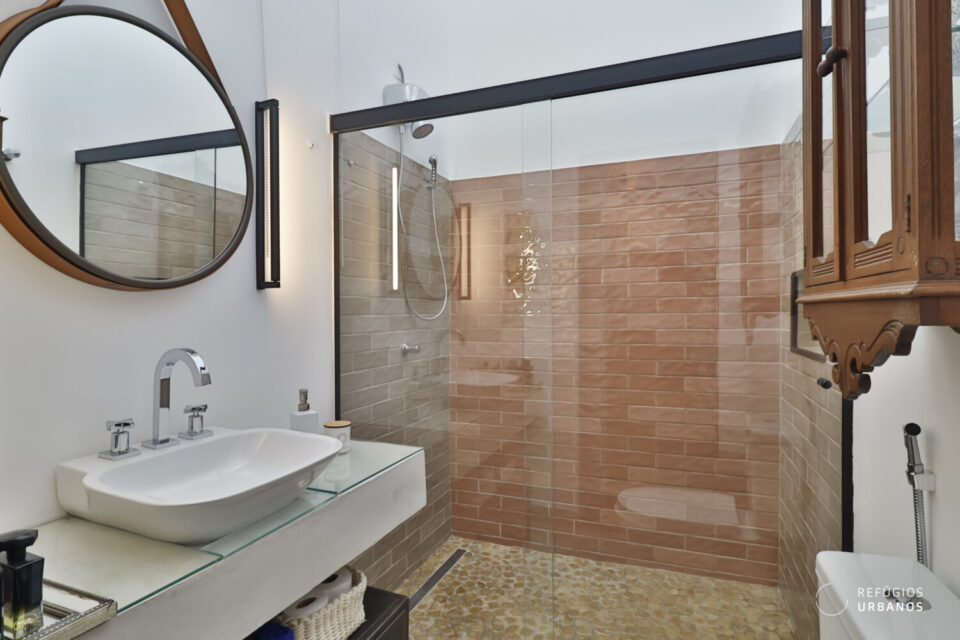 Por fim, chegamos à edícula onde fica a suíte, hoje usada como office e quarto de hóspedes. No espaço dedicado ao banheiro, uma super sacada para melhorar o aproveitamento dos espaços. Ou seja, o local é banheiro e também é utilizado como área de serviço. O espaço junta os dois ambientes de forma harmônica. Vale mencionar o piso do box, de pedras de rio.