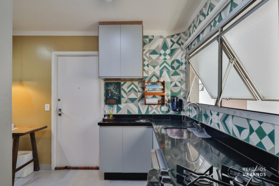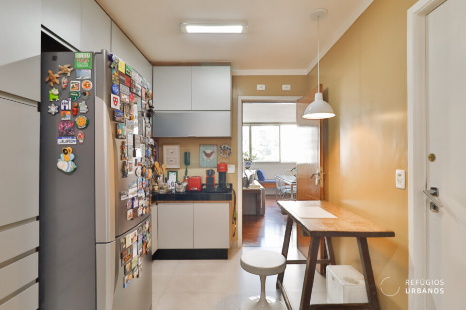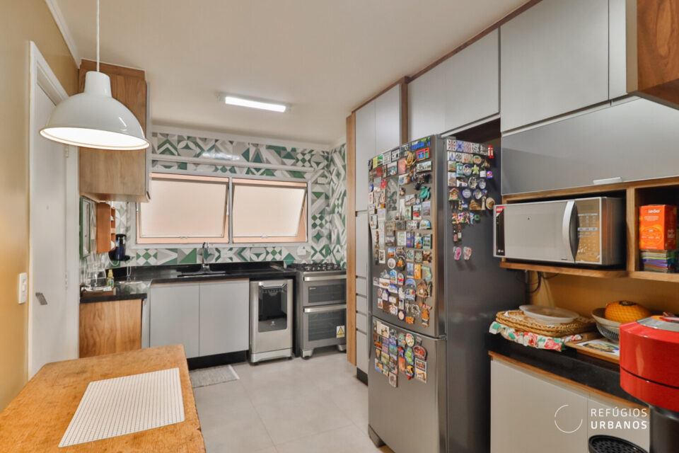 A cozinha passou por reforma completa: hidráulica e elétrica atualizadas, além de marcenaria nova que une funcionalidade e design. A área de serviço também foi reformada, oferecendo bastante espaço e armários para organização.