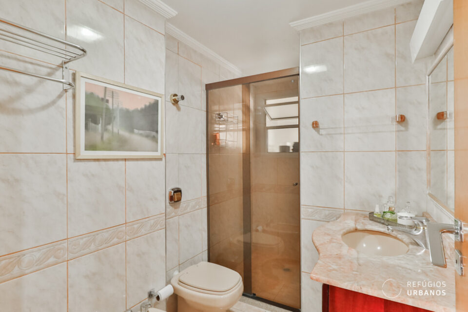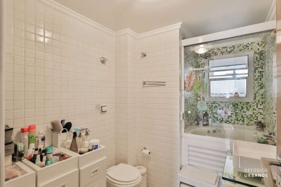 Um manteve o armário original, mas recebeu modernização elétrica e hidráulica. O outro passou por transformação maior e agora conta com mini hidromassagem, perfeita para relaxar nos dias frios, além de janela modernizada.