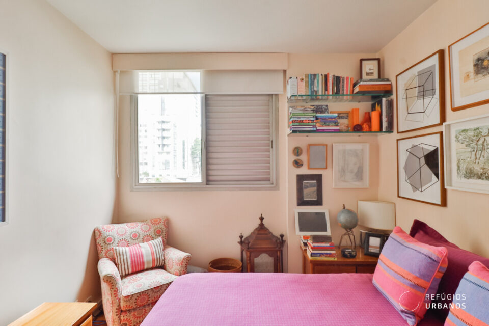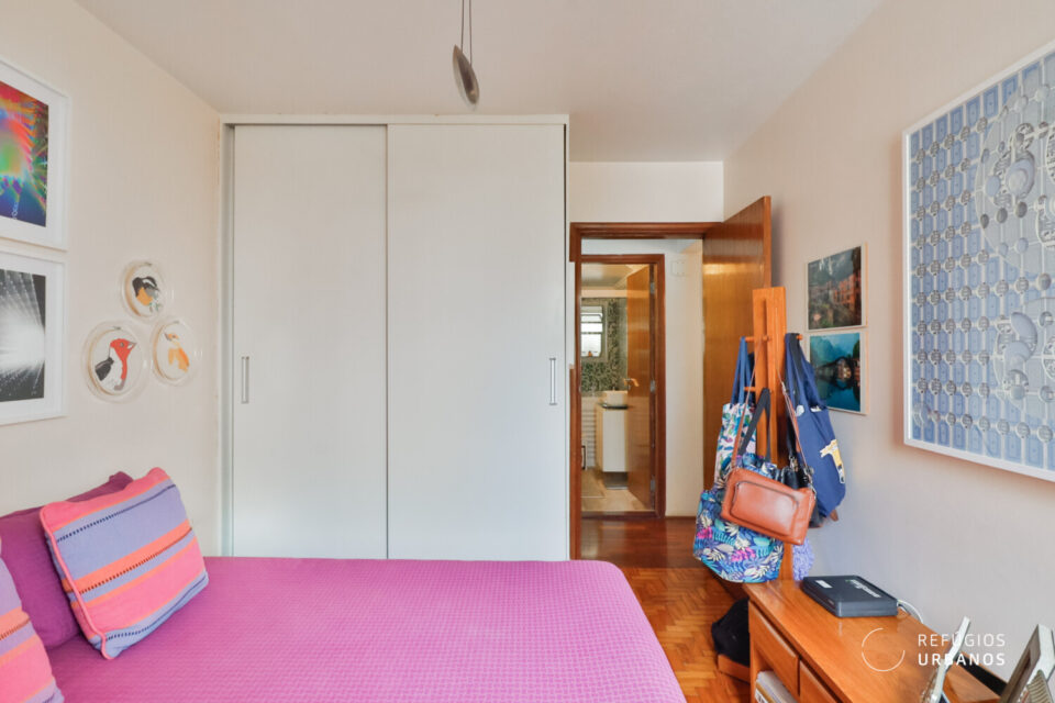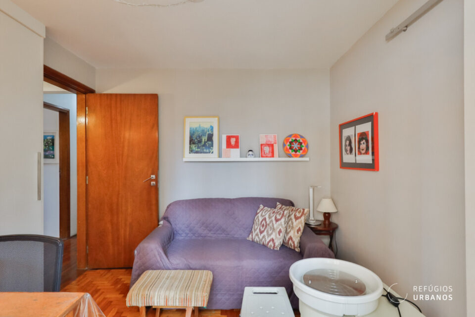 O segundo quarto também é amplo, com marcenaria renovada. O terceiro dormitório, atualmente ateliê, também se conecta à varanda e à área de serviço, podendo facilmente ser transformado em closet.
